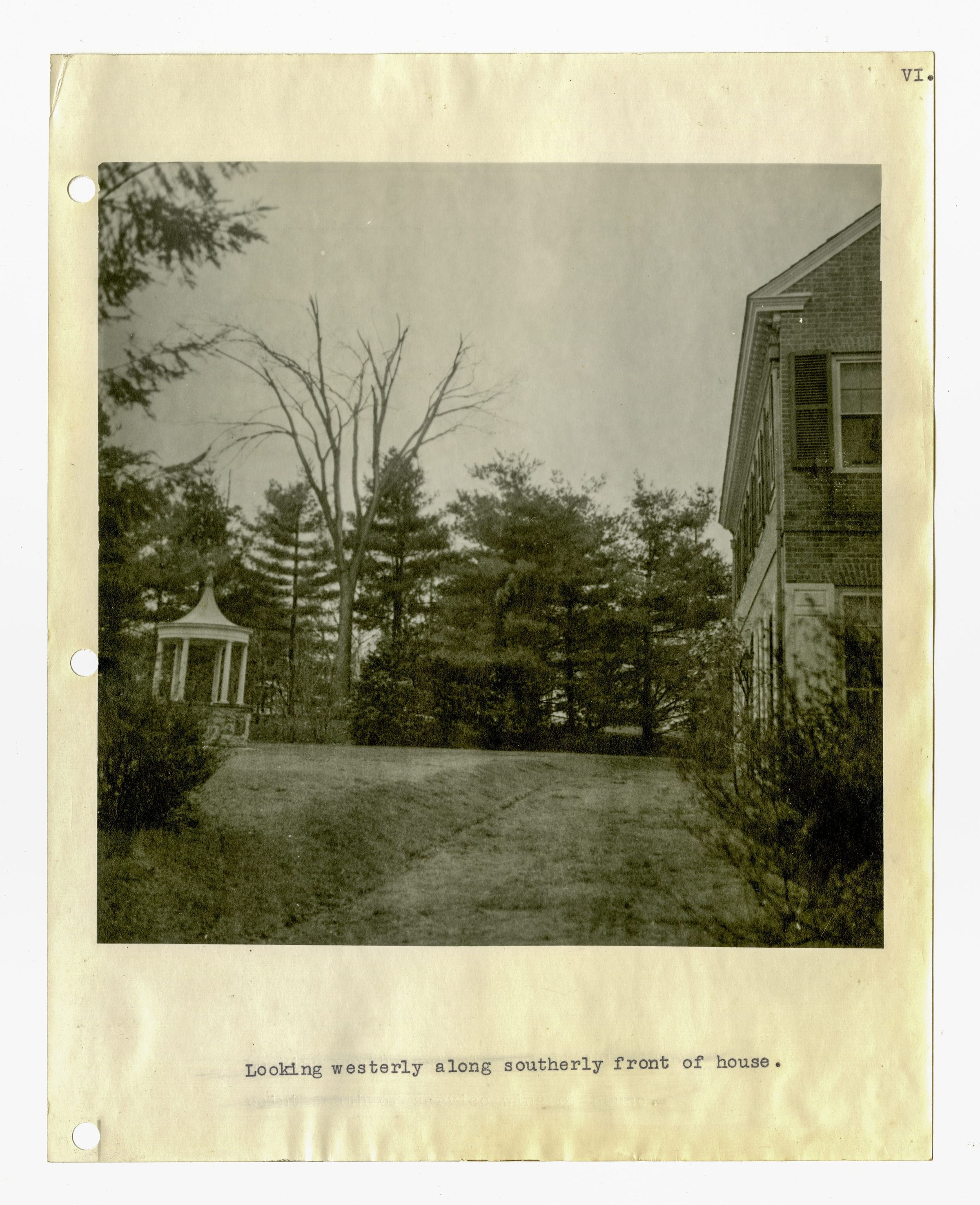 A view of the southern side of the house looking west, with a row of trees and well in view.