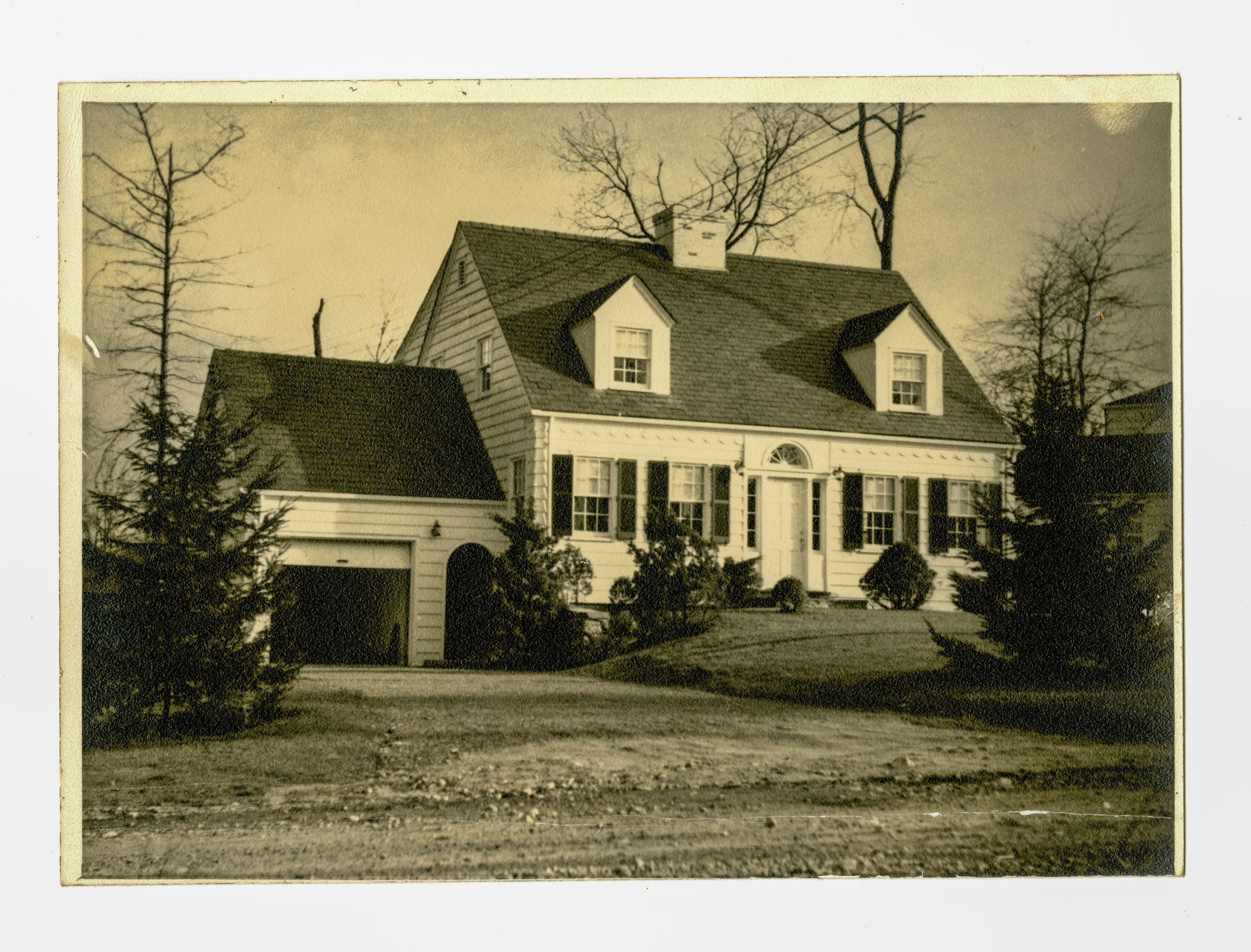 A front view of a two-story clapboard house with a two-door garage on the left of the image.