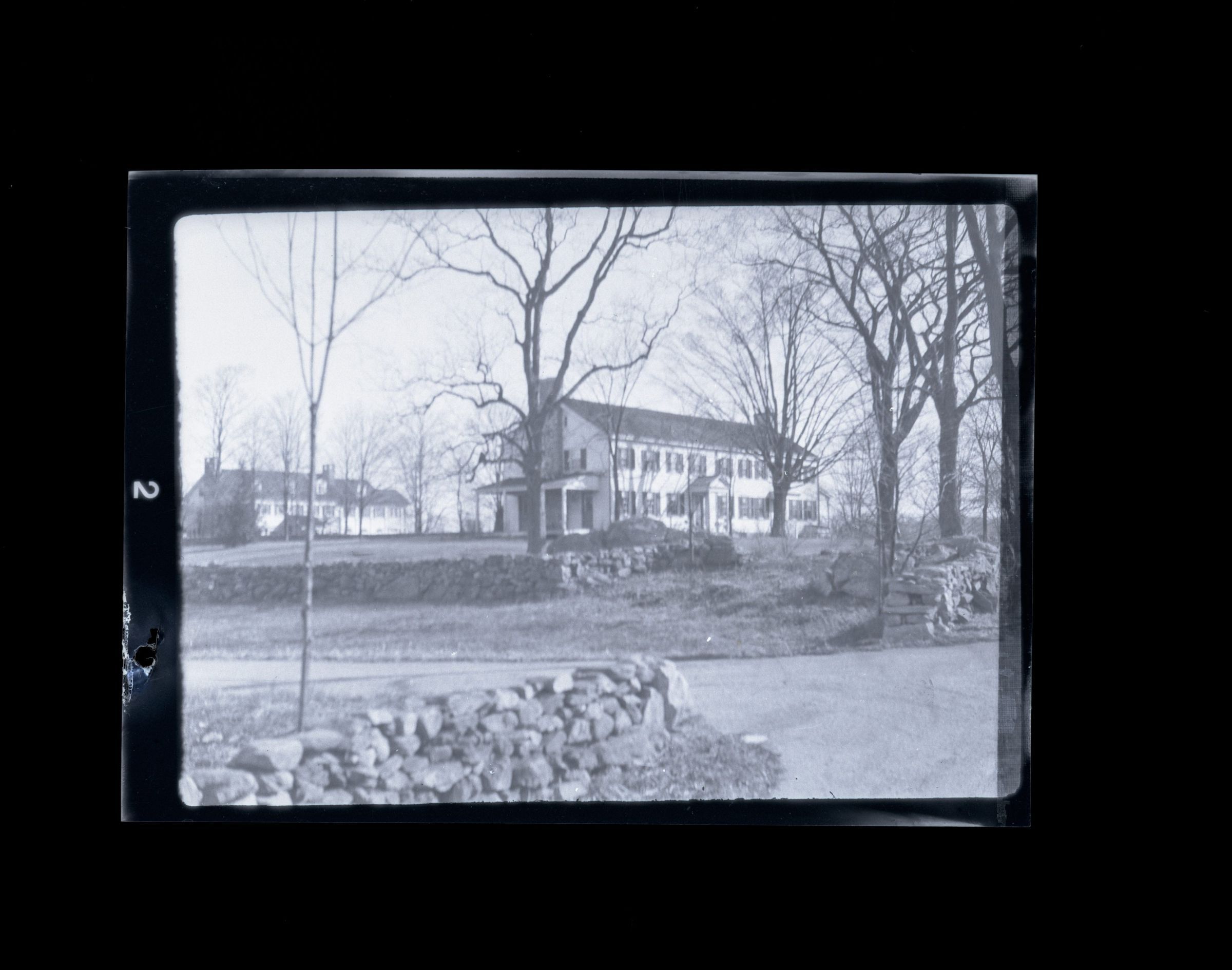 A view of a home from the street with stone walls marking the boundaries of the property.