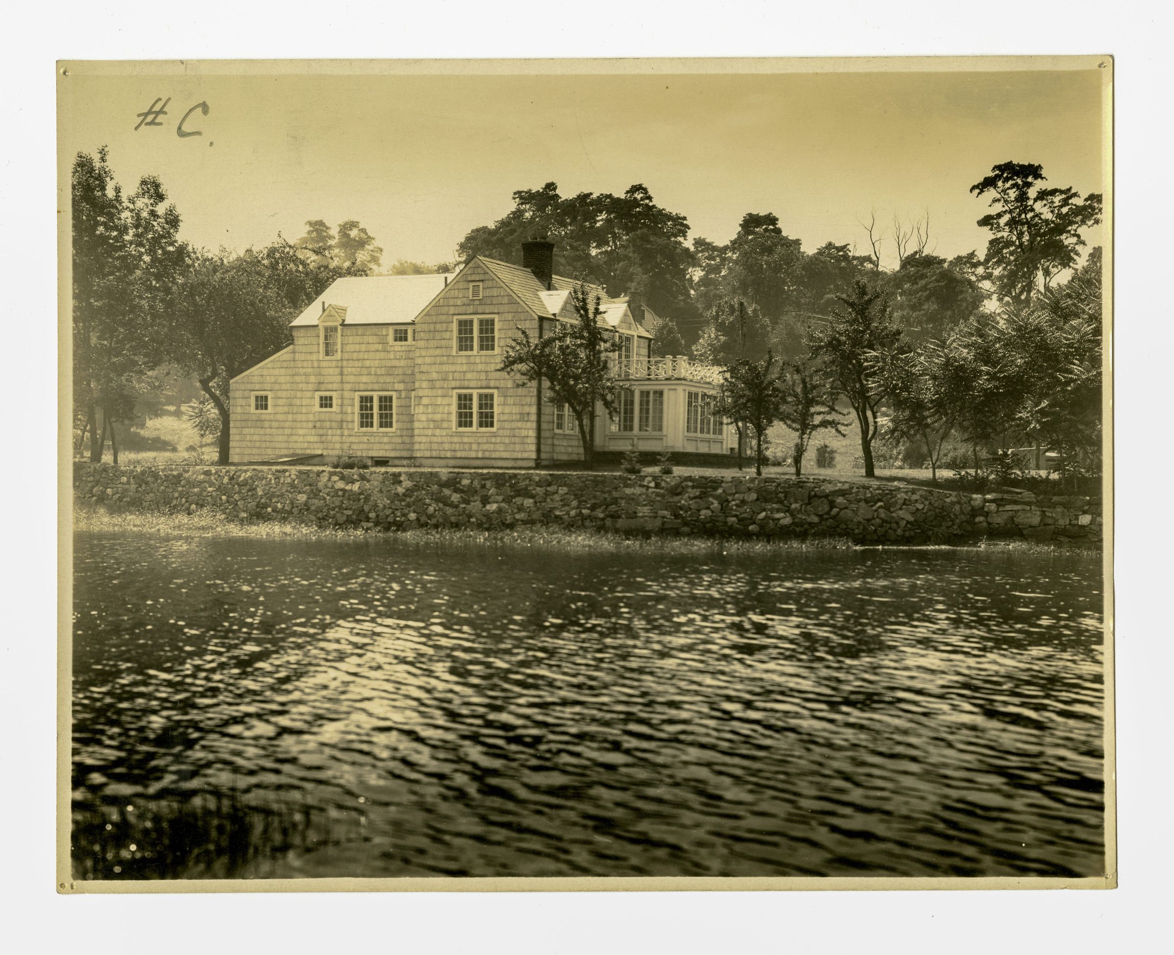 A view of a Cape Cod style home from the Mianus River with a view of the first-floor terrace and the stone embankment.Collection