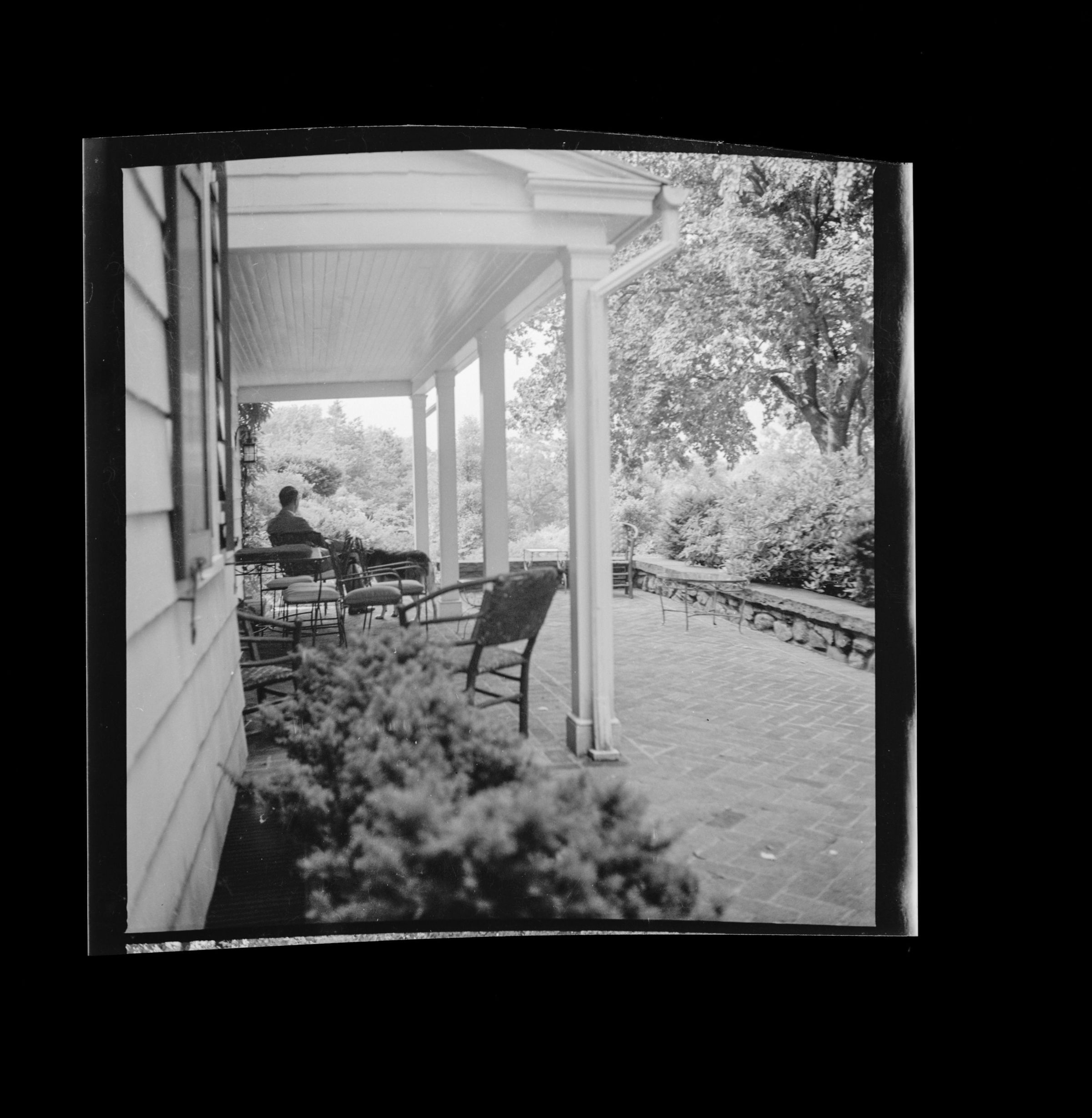 A view of a partially covered brick patio with a number of chairs and small tables. A man is sitting in one of the chairs with his back turned to the viewer.Collection