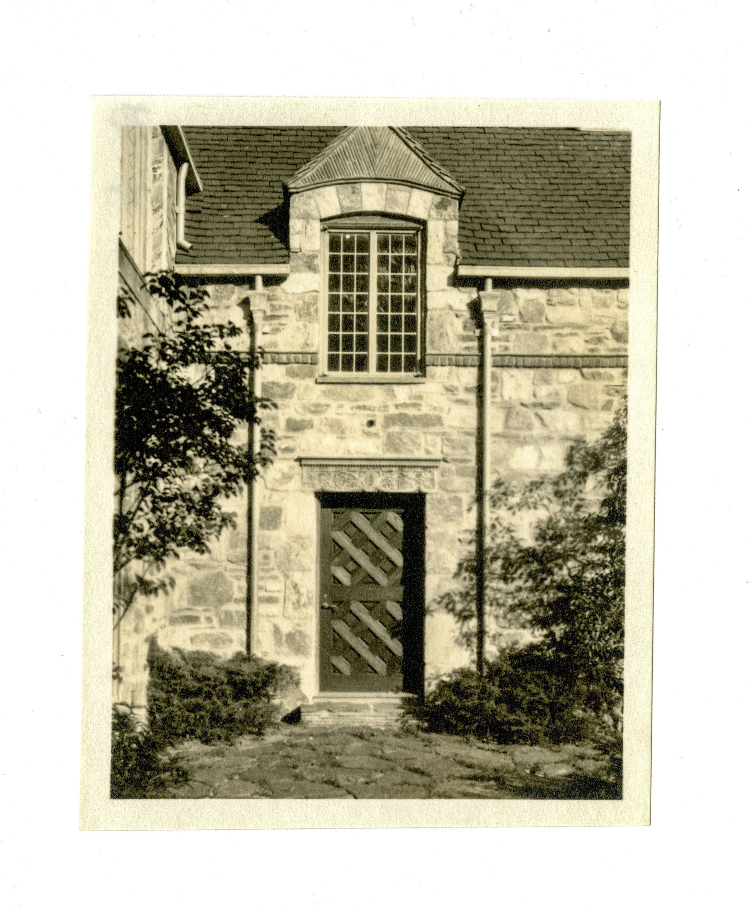 A detail of the home showing a door with geometric carving. The home has stone walls.Collection