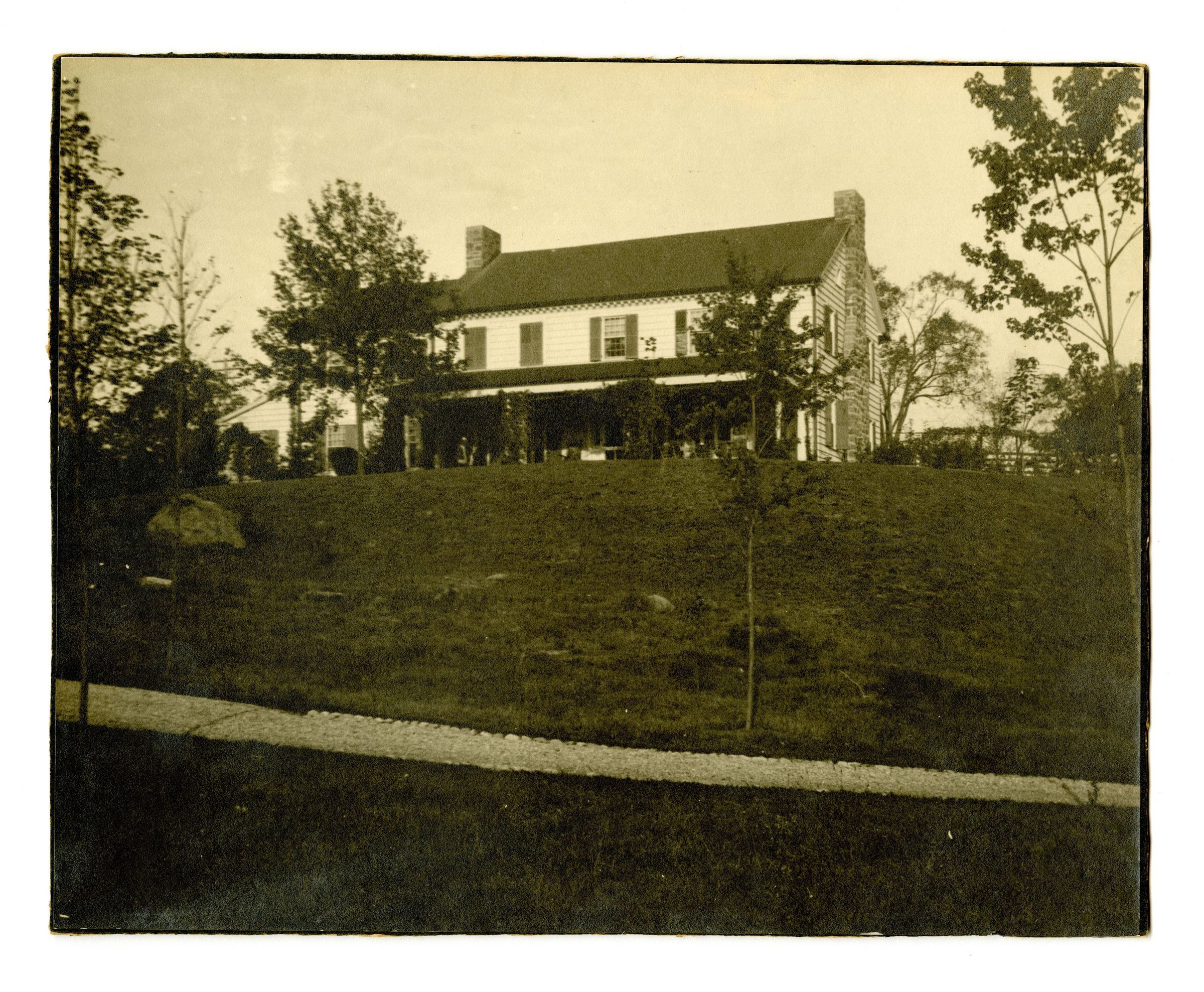 A view of a clapboard home with a covered porch and two stone chimneys on either end of the house.Collection