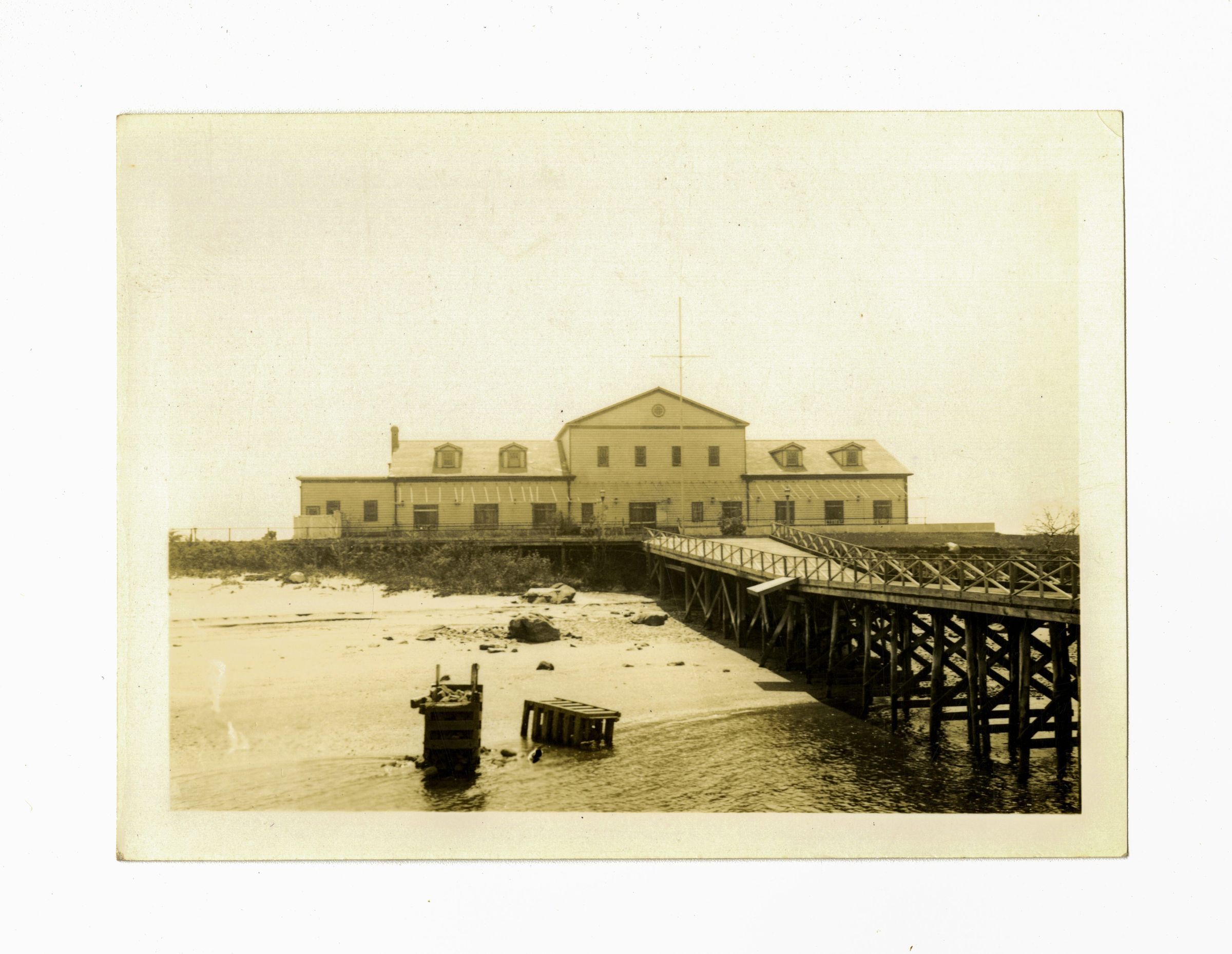 A view of the clubhouse on Great Captains Island, a sandy beach, and the boardwalk that leads up to it.