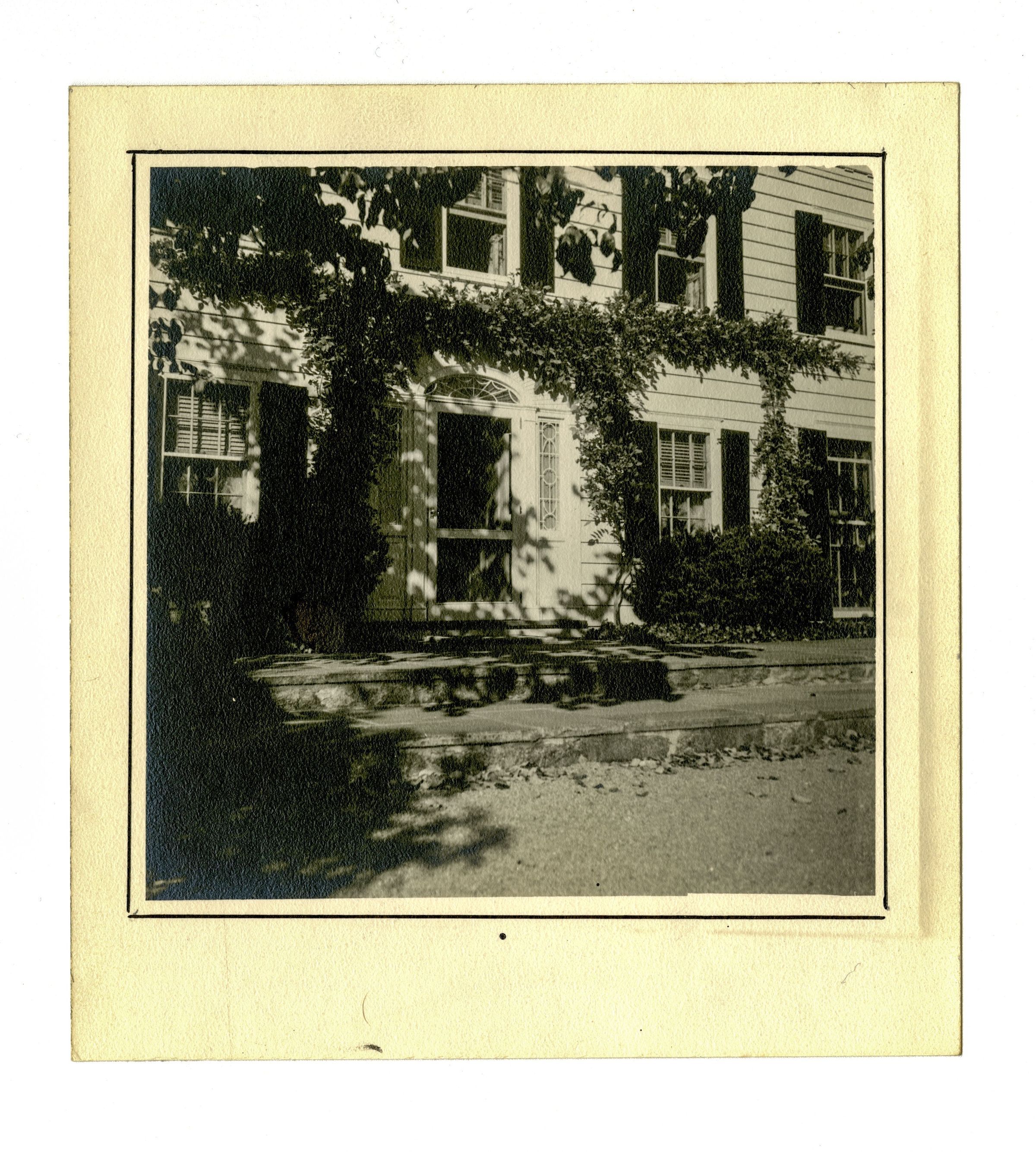 The entrance to the home with ivy growing around the door with flagstone steps in front.