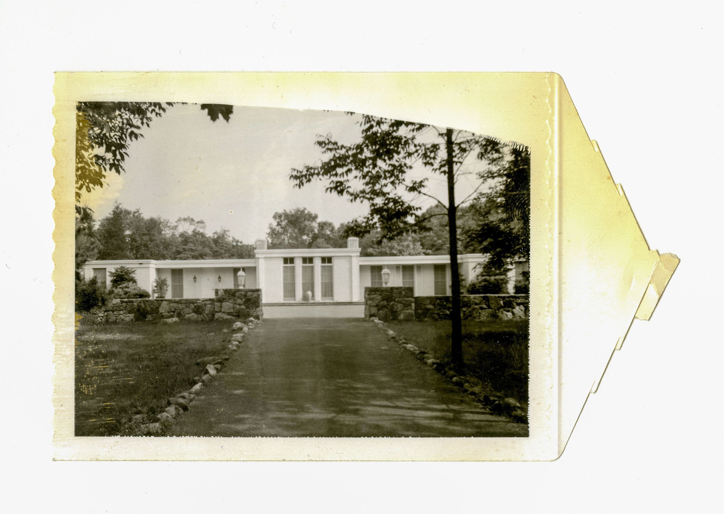 A view of the approach to the home. The home is a one-story mid-century building painted white.