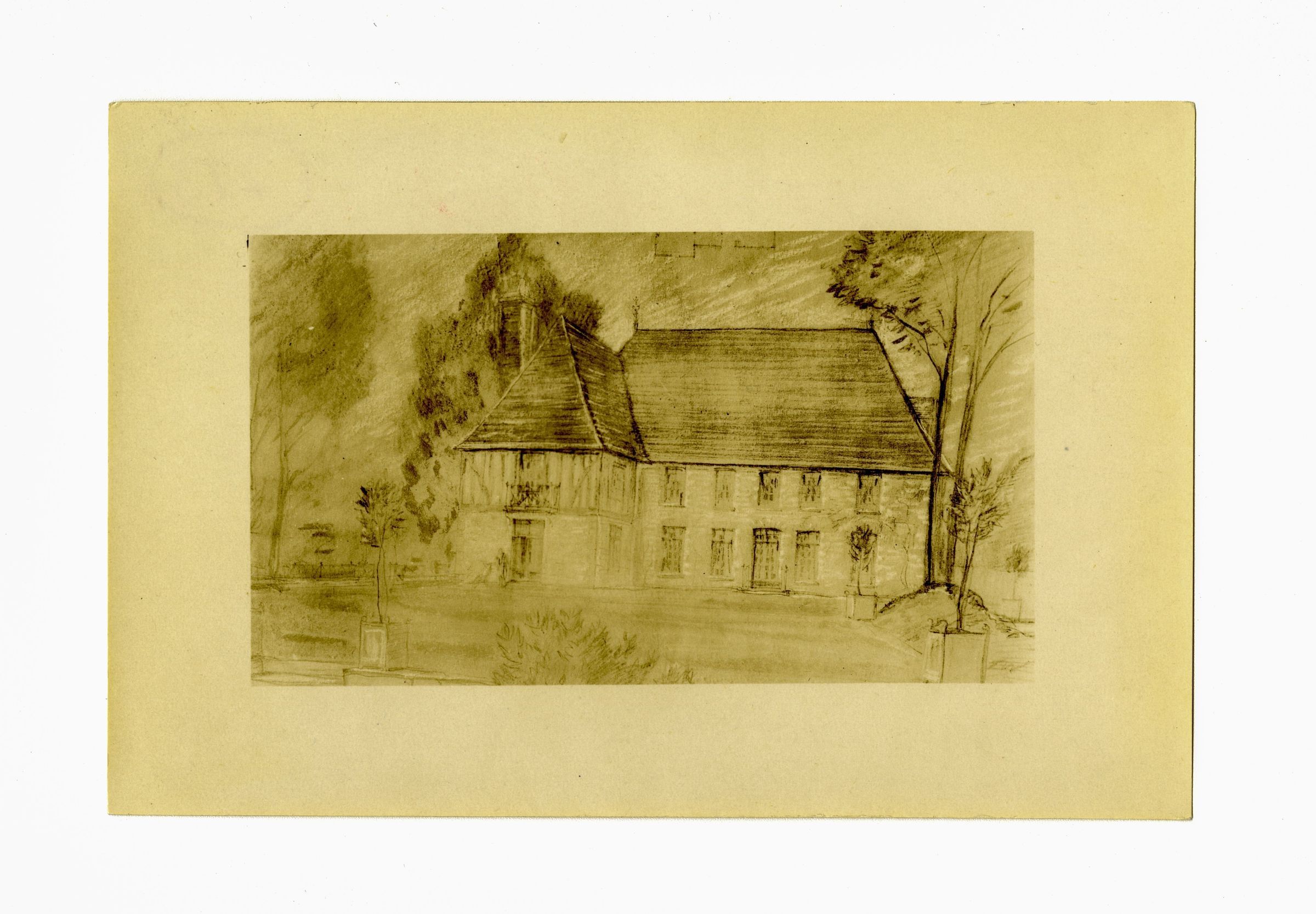 A drawing of a building with stone walls on the ground floor and wood and plaster on the second floor.Collection