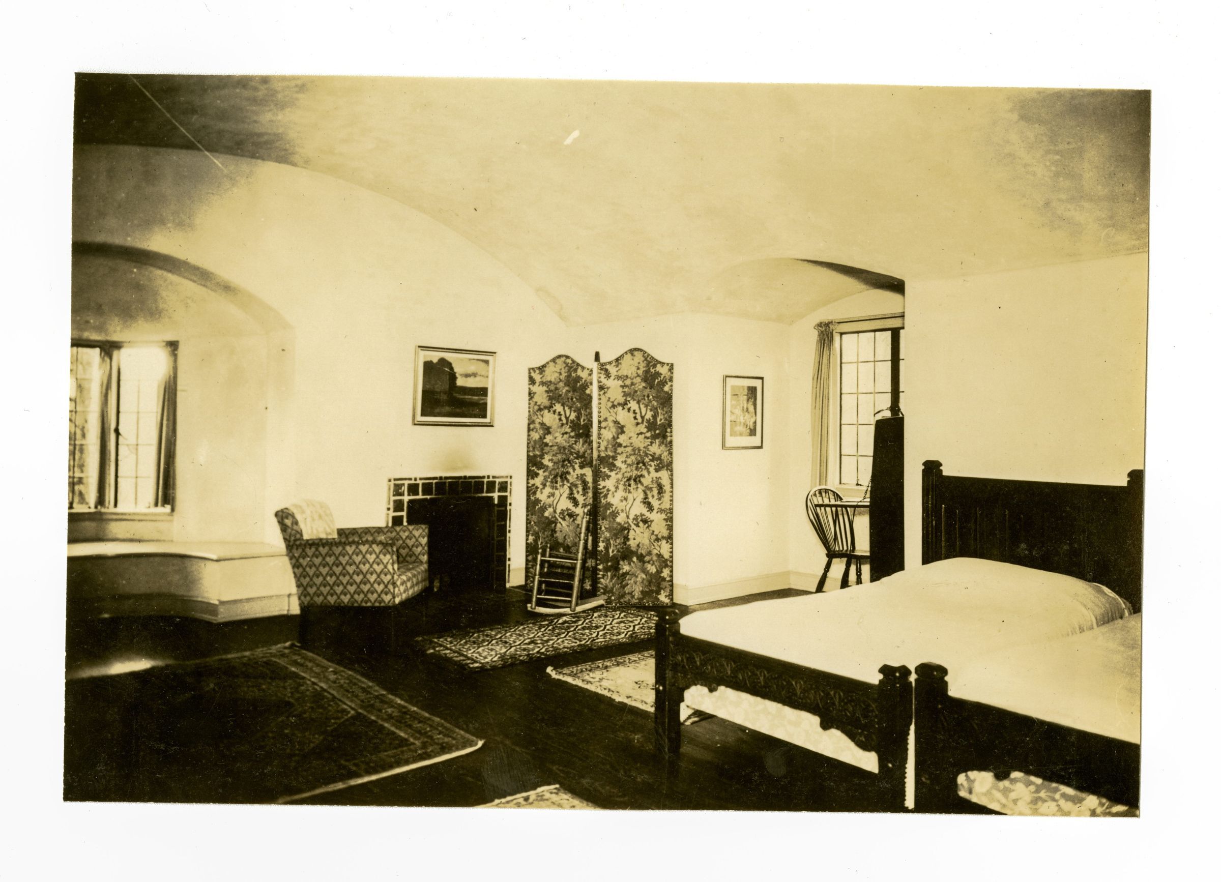 A bedroom with two beds on the right of the image and a decorated screen in the center of the image.Collection
