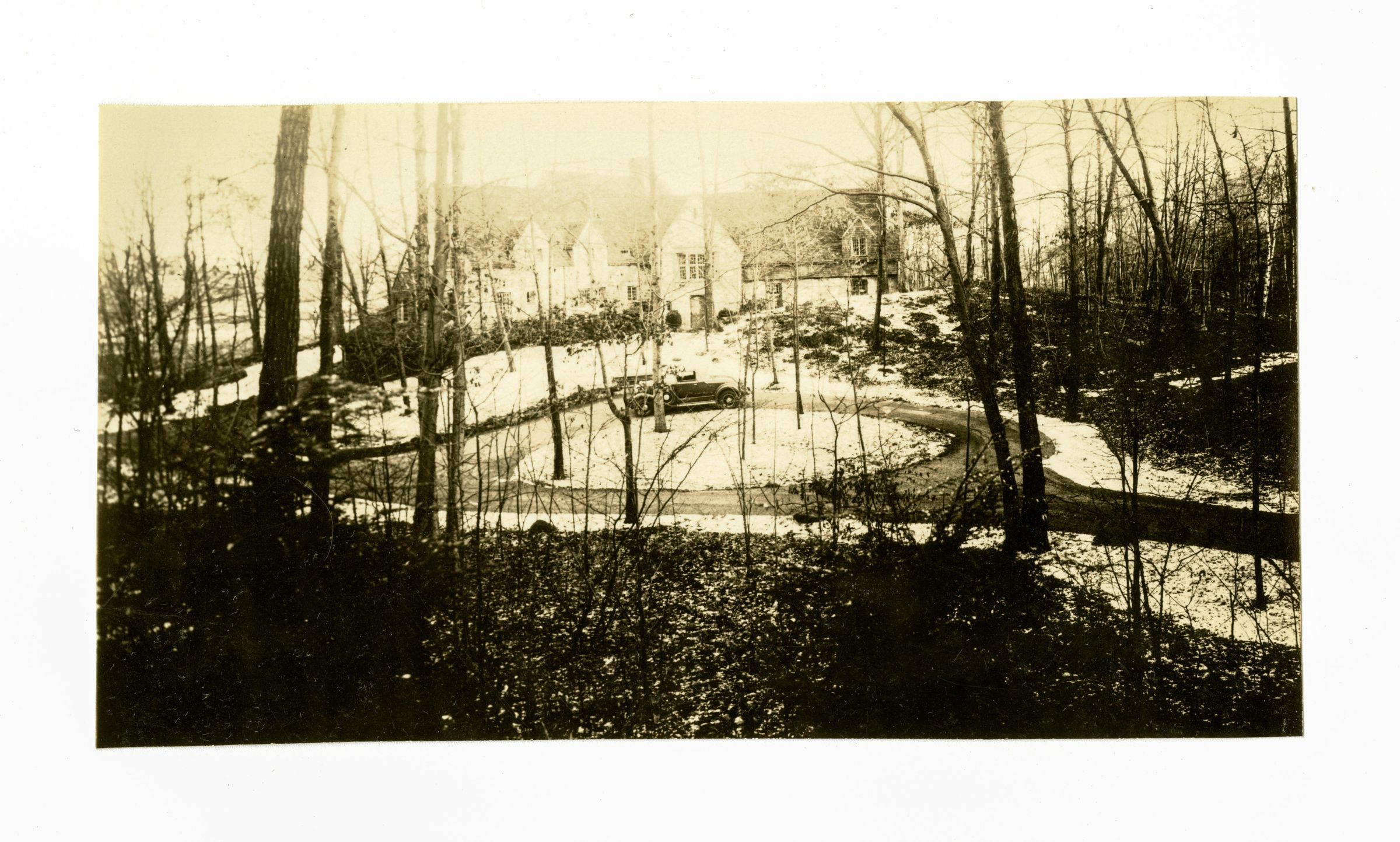 A view of the house from woodlands looking down at the driveway where a car is parked.