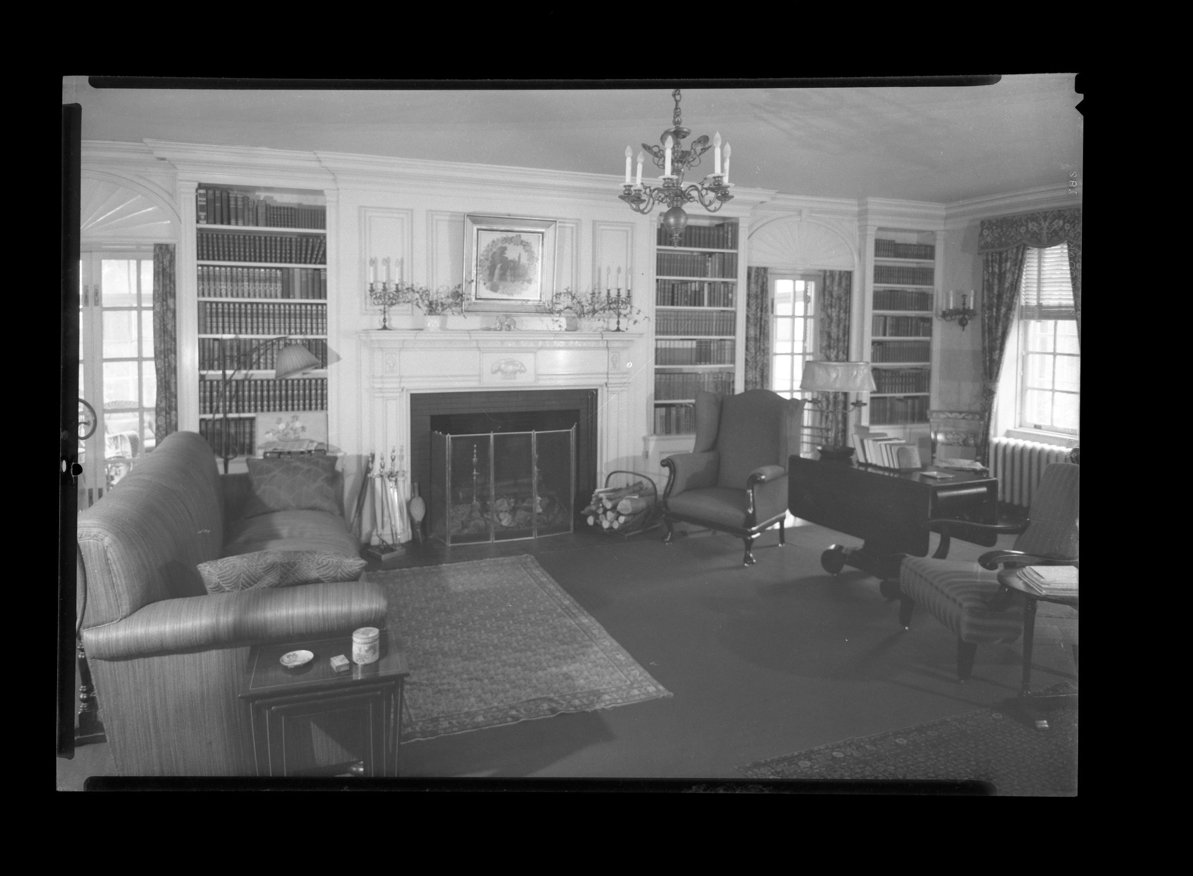 A living room with a fireplace, mantelpiece, bookcases, chairs, and sofa.Collection