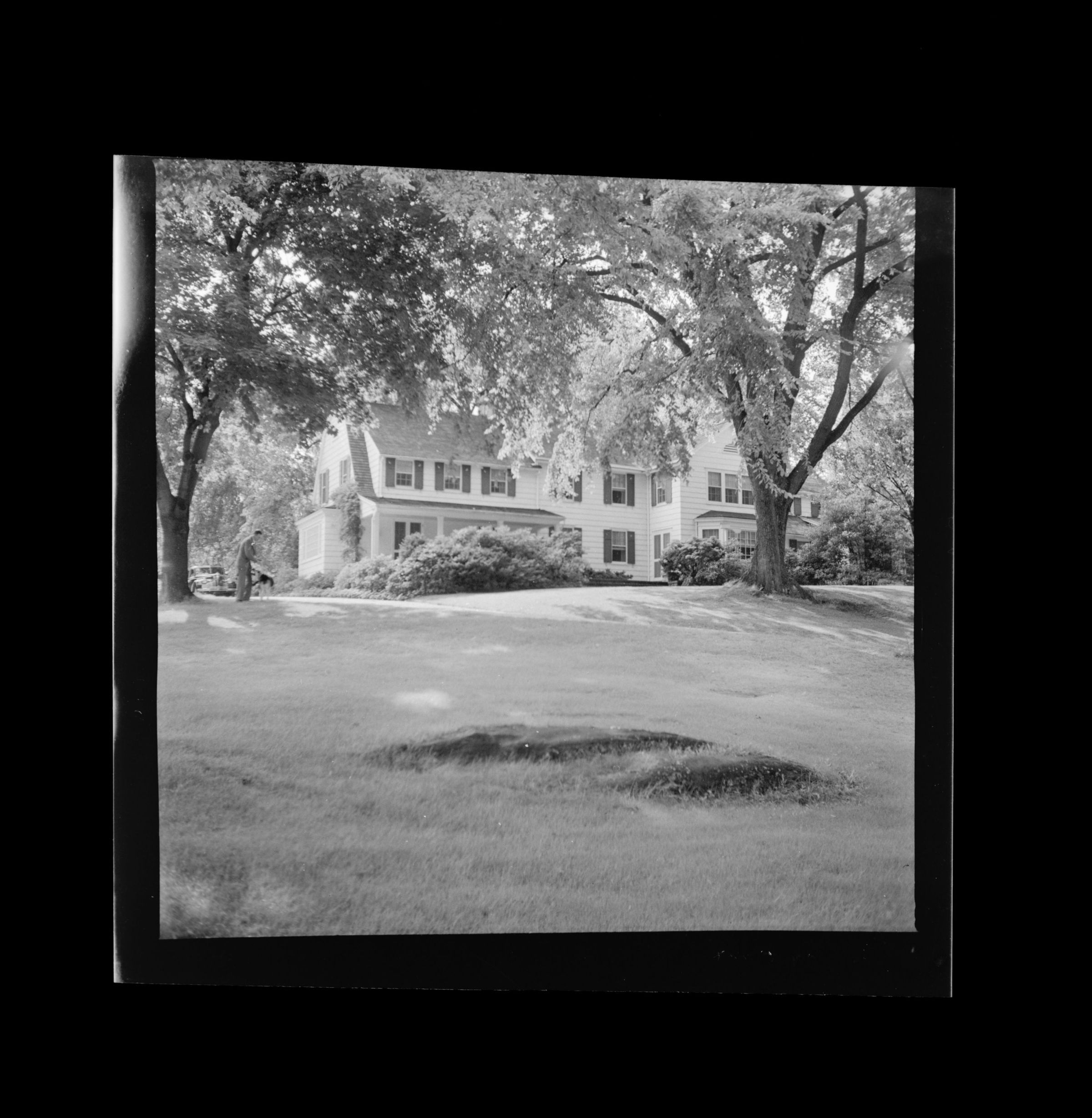 A view of the rear of the house and part of the lawn. A man and a dog are pictured to the left of the picture.Collection
