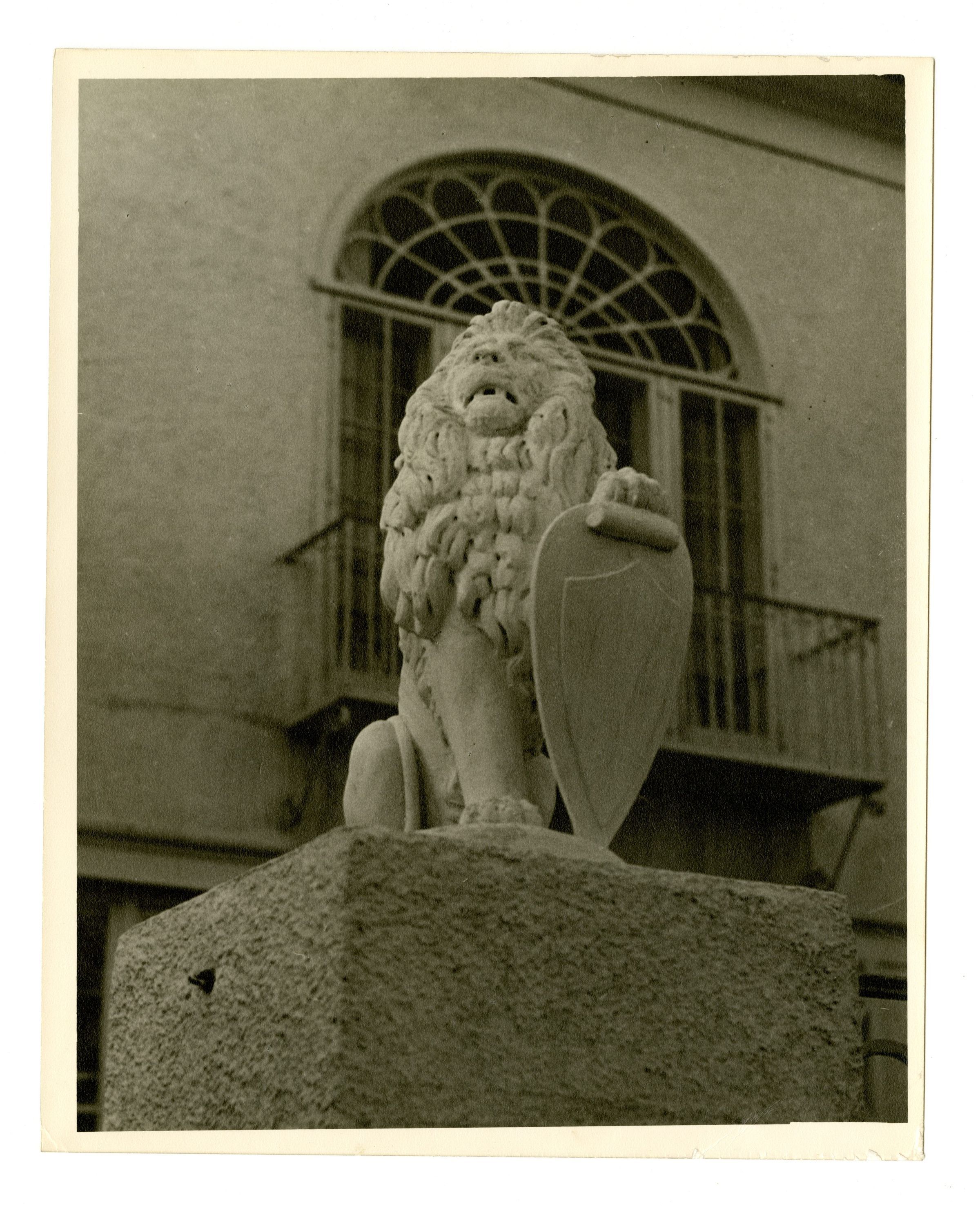 A statue of a lion with its paw on an unadorned shield. The statue is on top of a square plinth. A window and balcony are visible behind the statue.Collection