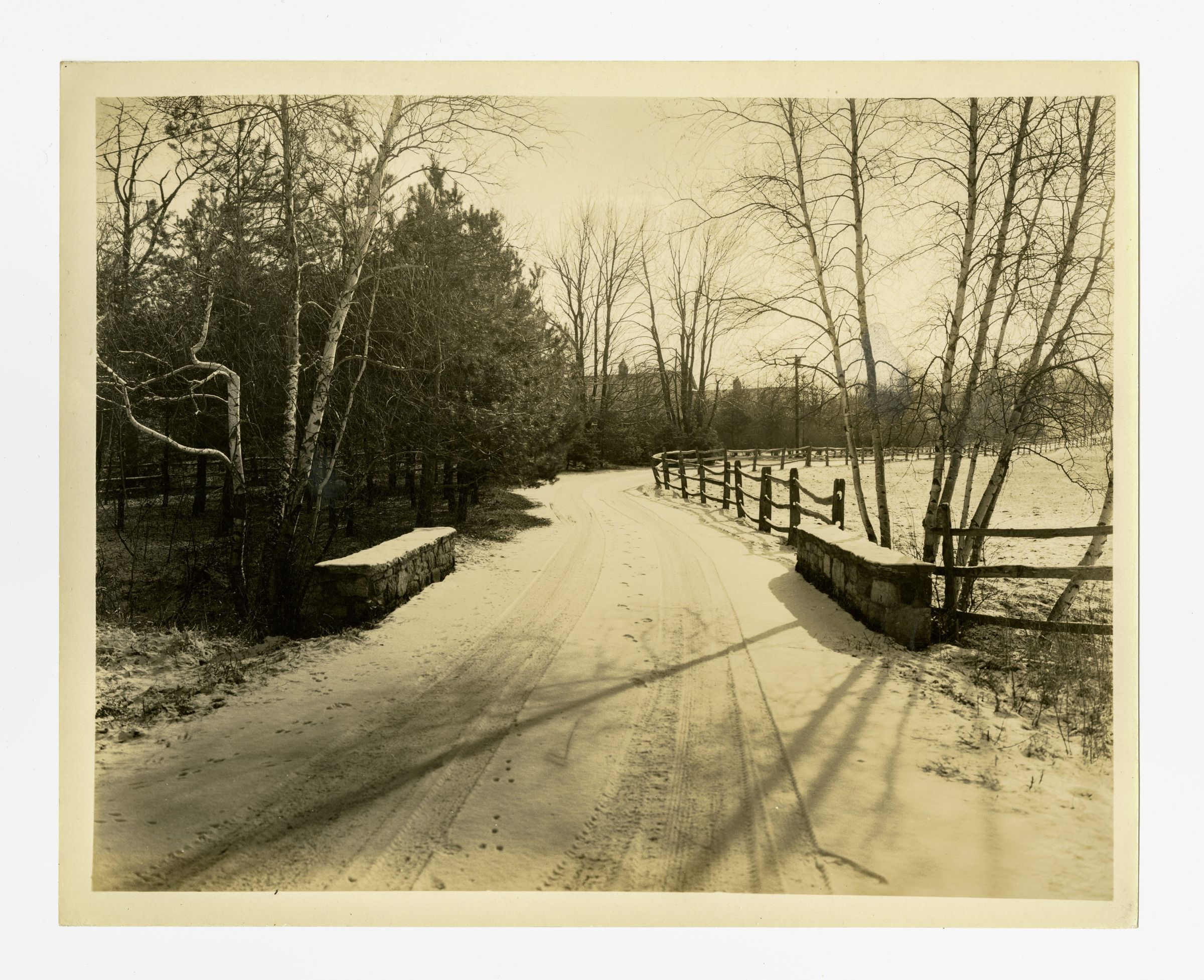 A snow covered road and wooden rail fences.