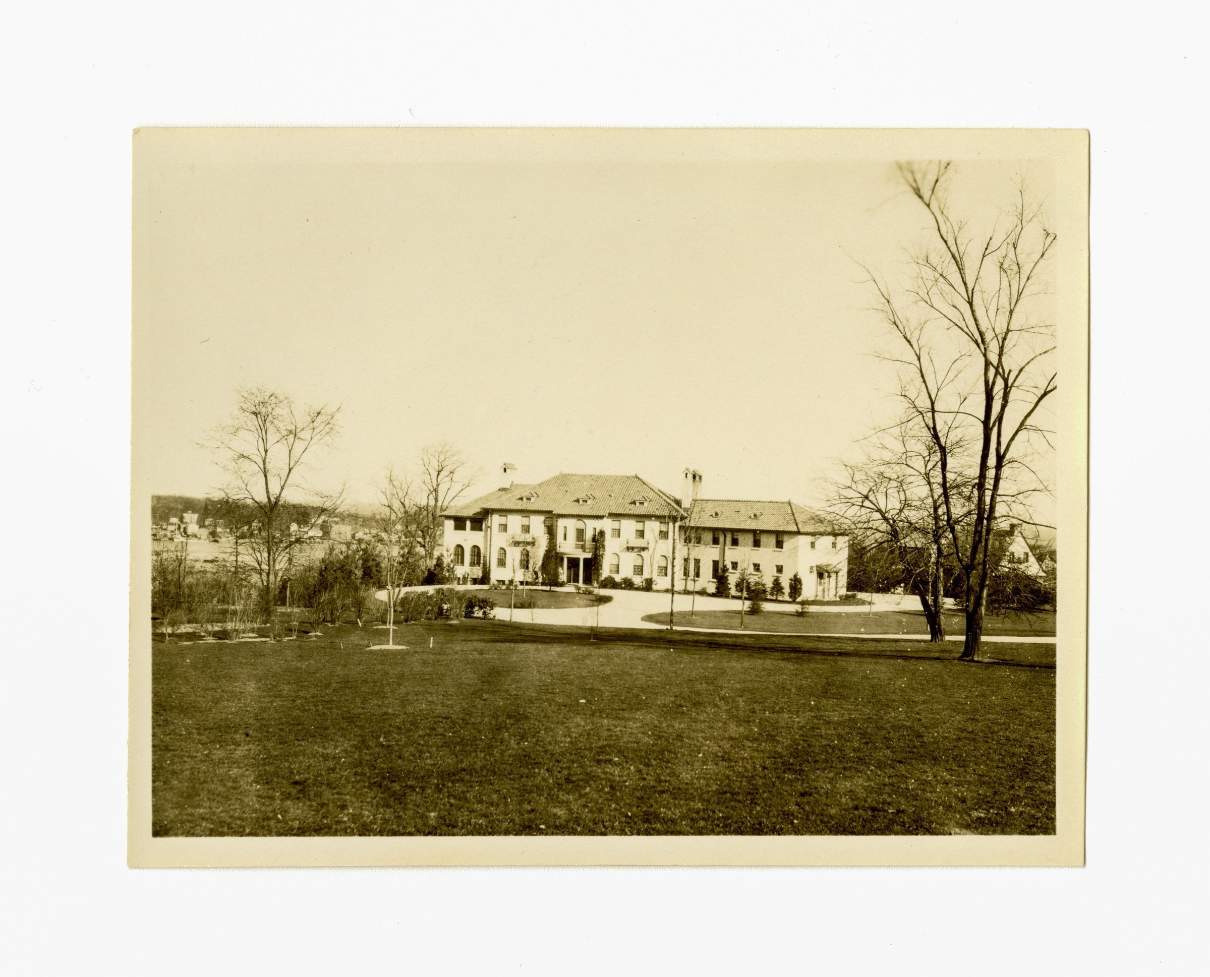 A large home with tile roofs with its driveway and lawn.
