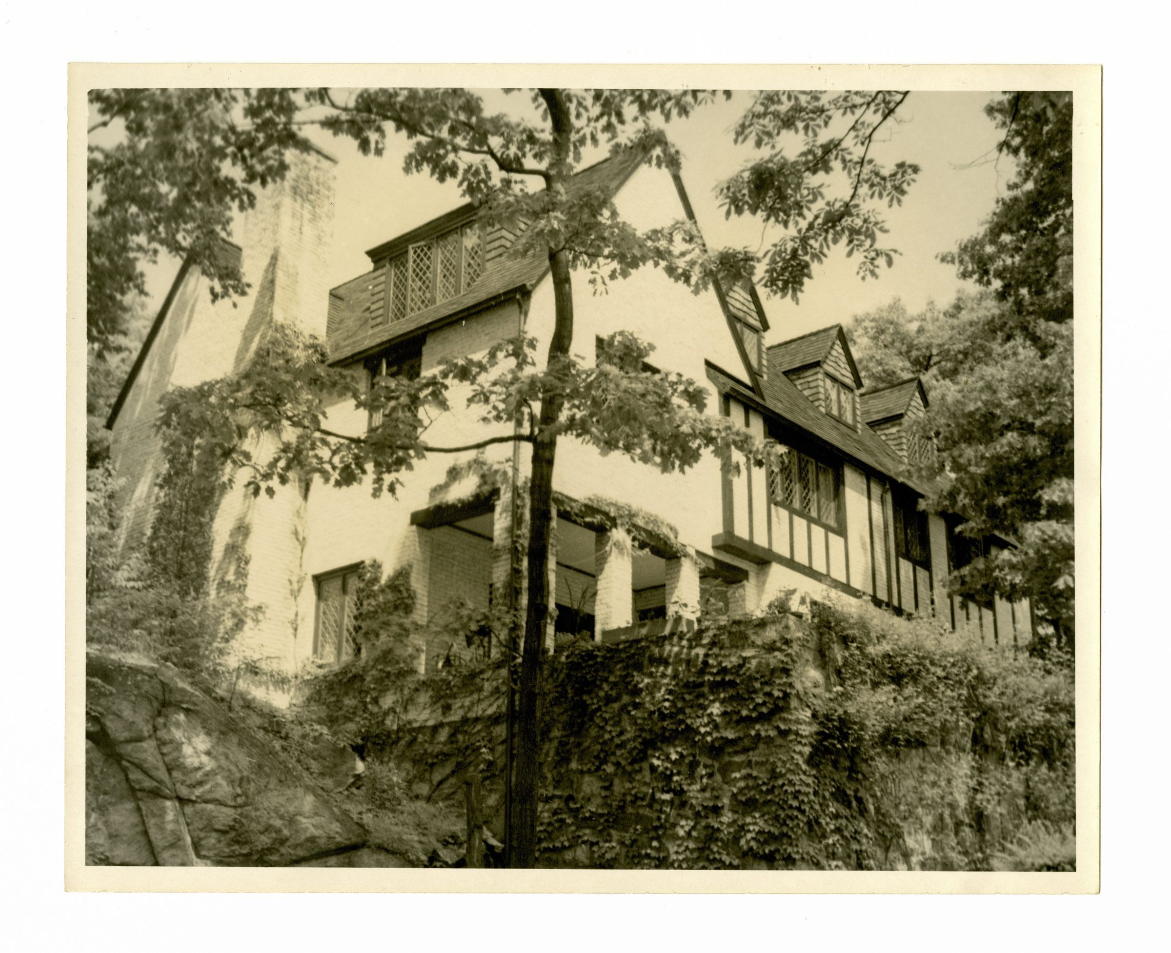 An English cottage style home made of white brick.