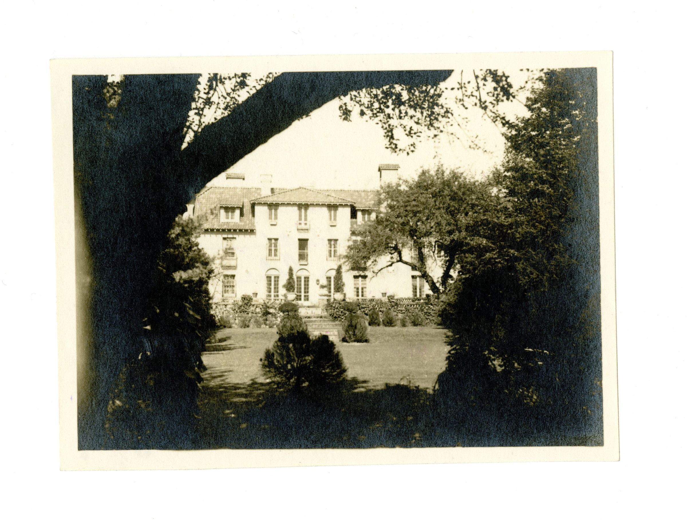 The rear of a large Italian villa-style home with a tile roof and a portion of the gardens.