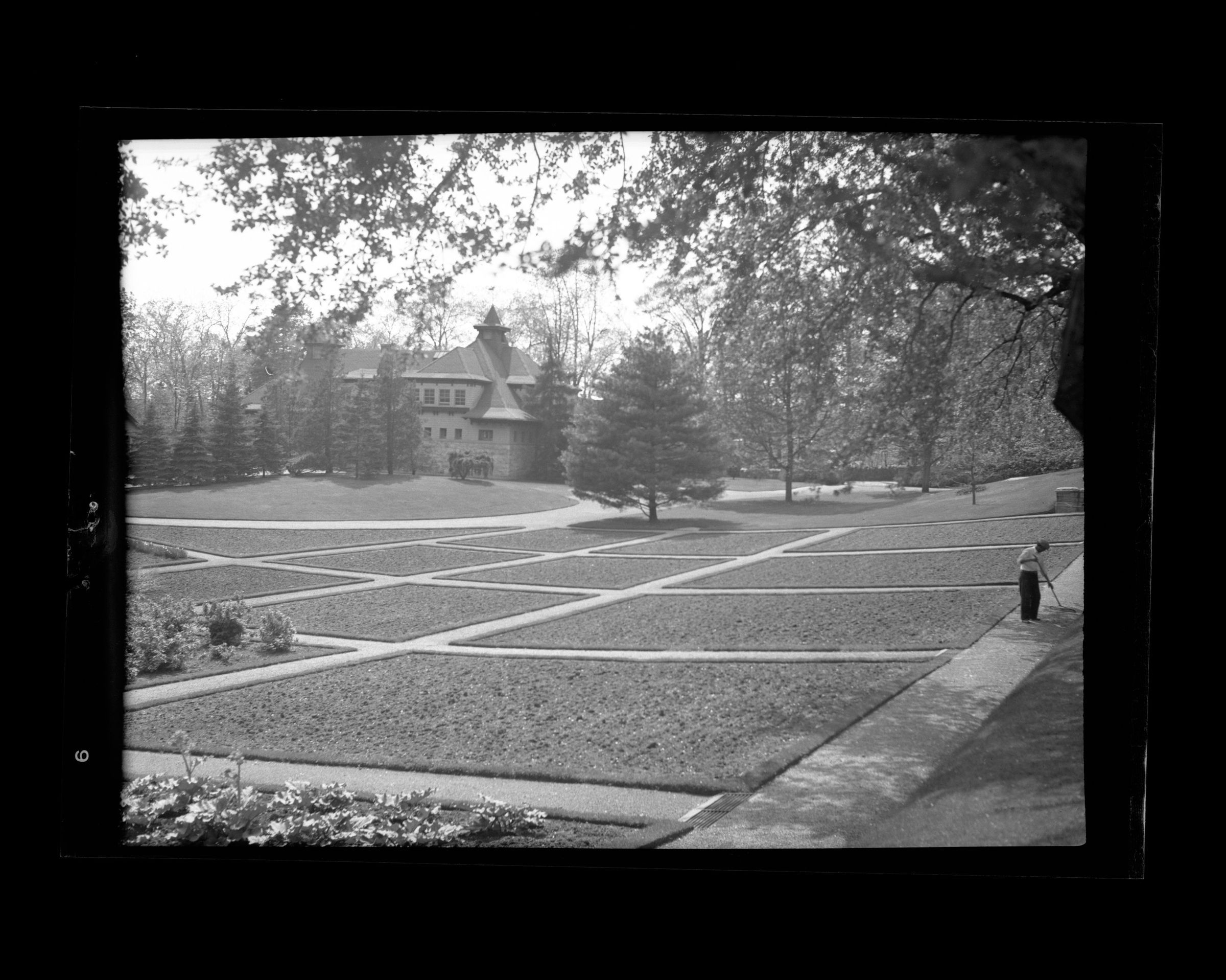 View of the gardens with the house in the background and the gardener on the left side of the photo.Collection
