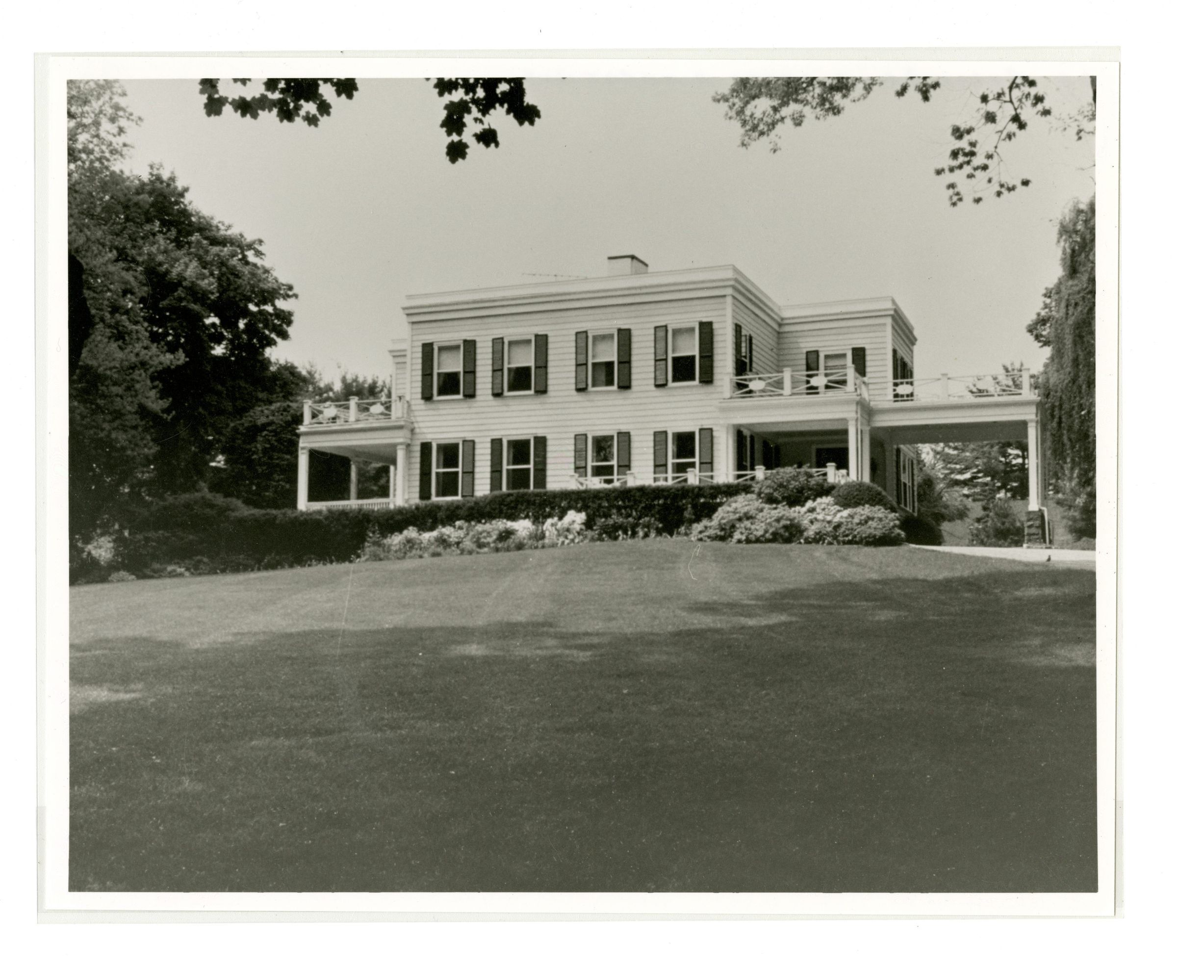 View of a two story house in the Federal style with covered porches on either side of the first floor and open porches on the second floor.Collection