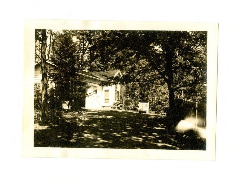 View of the front of the house showing two lounge chairs and a stack of firewood.