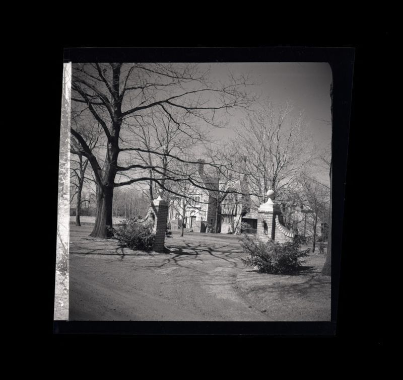 View of the front of the house through the trees and gate.