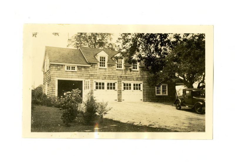 View of the garage with a car in front.
