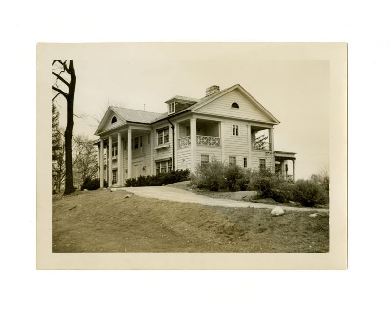 View of the front of the house with a large portico and porches from the driveway.