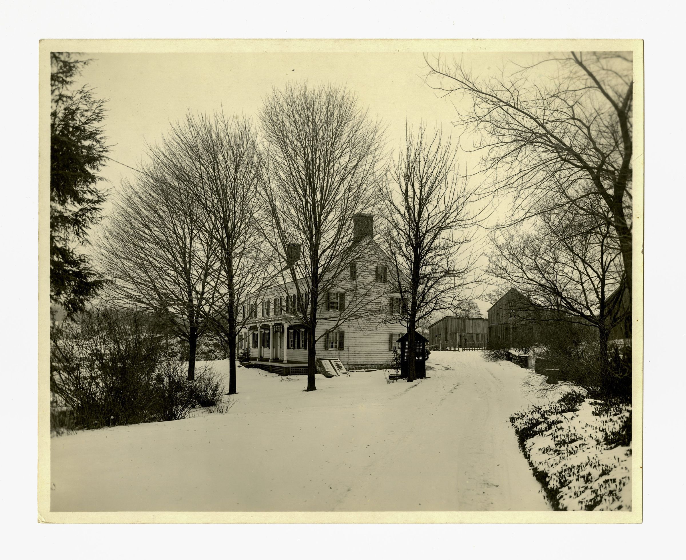 A view of the side of a three-story house and several outbuildings behind it in the snow.