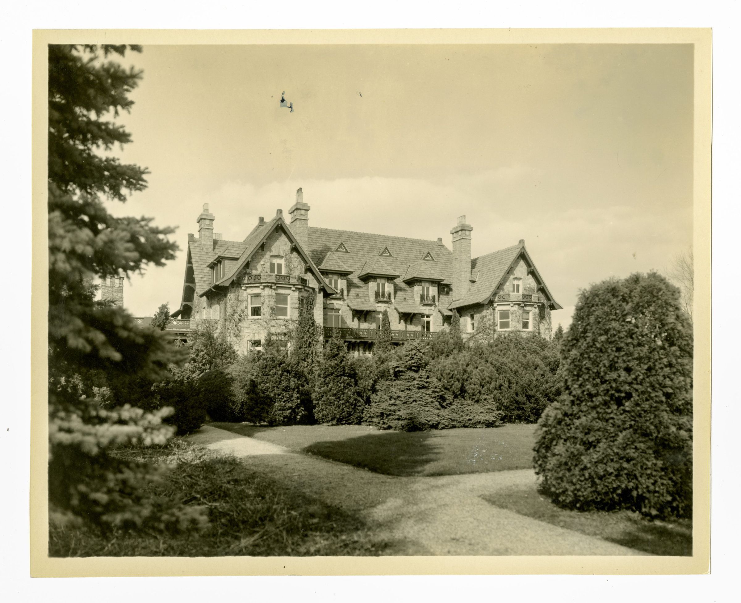 A stone home with part of the gardens in view.
