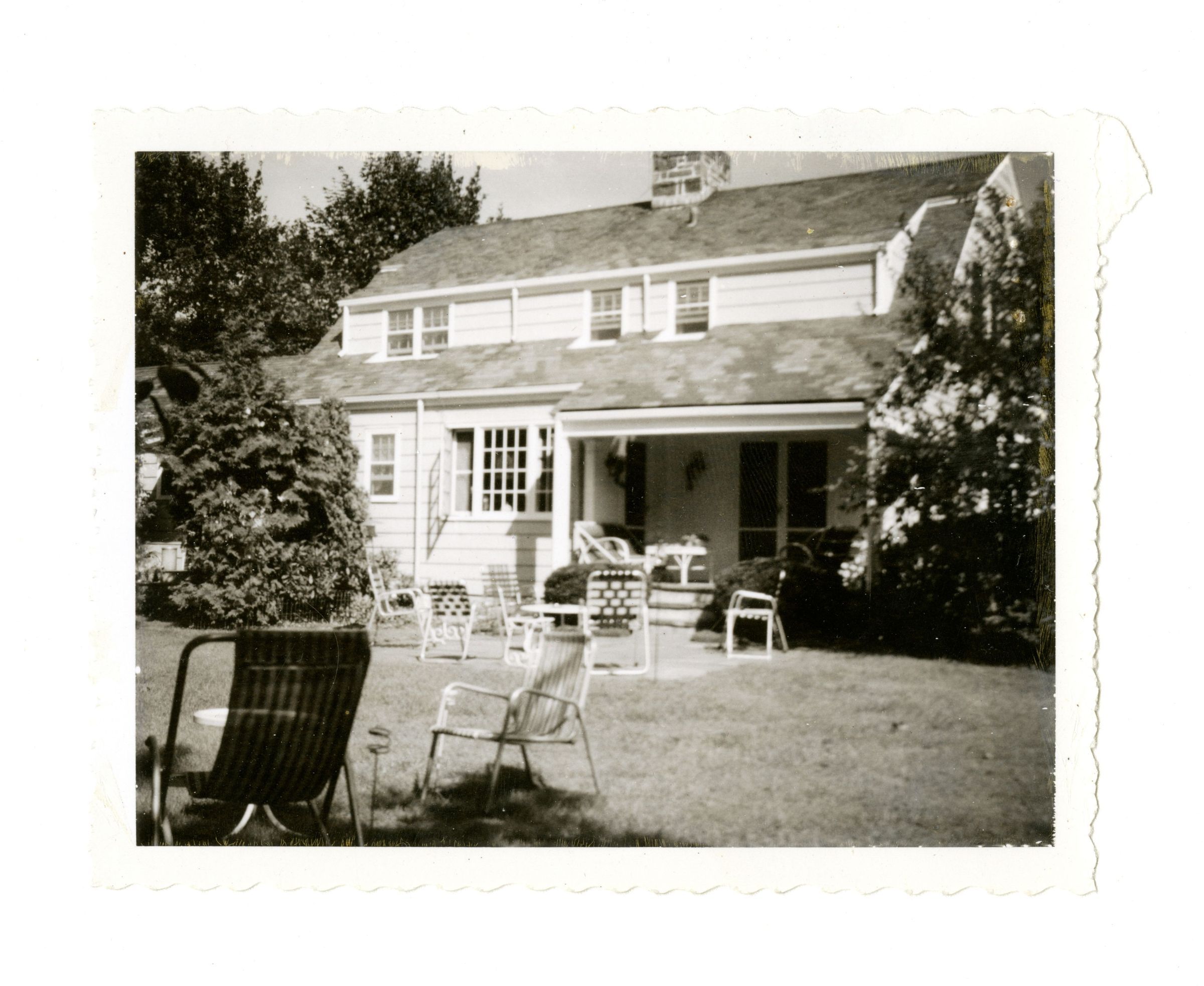 The lawn of a house with a number of lawn chairs on the grass and patio.