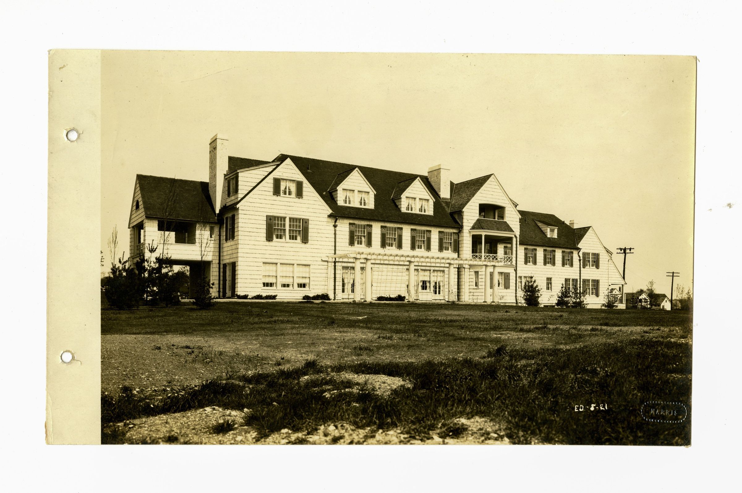 A large shingled house with a trellis-covered patio.