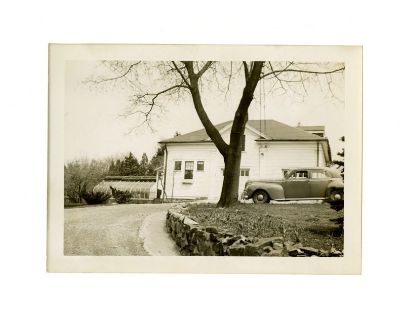 View of the side of the house and driveway with a car. In the background stands the greenhouse.Collection