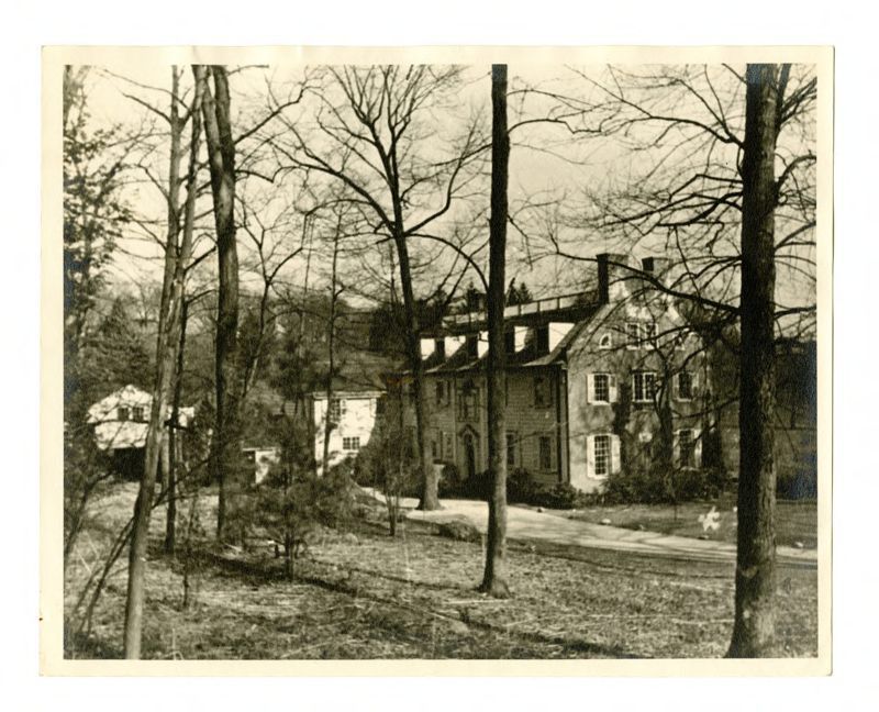 View of three buildings, possibly a residence and two outbuildings, through the trees.