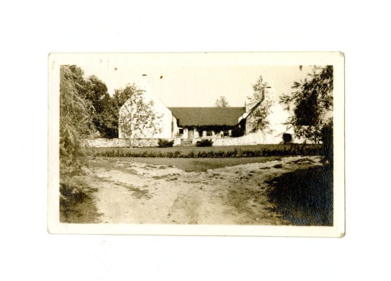 View of the sidie of the house showing a stone wall and the road.