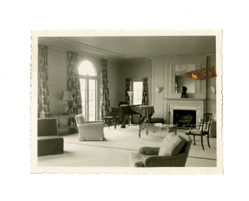 View of an interior room showing a grand piano, fireplace, seating, tables, long, floral curtains around French windows, and other antiques.Collection