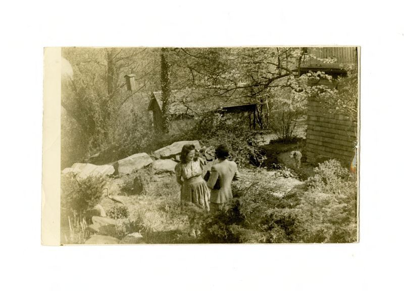 View of two people with a dog in the grounds, showing part of the side of the house, an outbuilding, a bird house, and a fake flamingo.Collection
