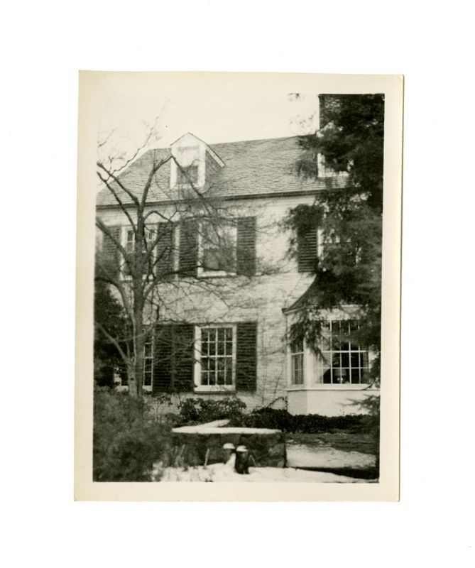 View of part of the front of the house in the snow showing a stone wall.Collection