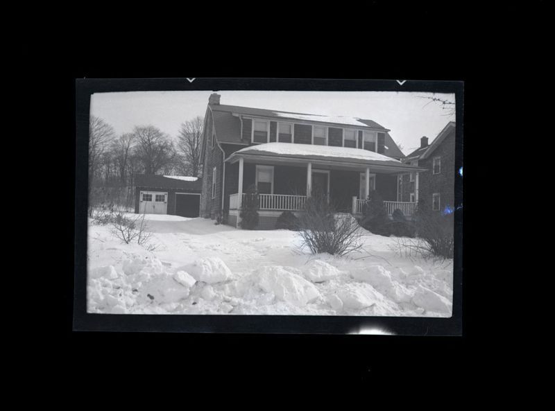 View of the front of the house in the snow.