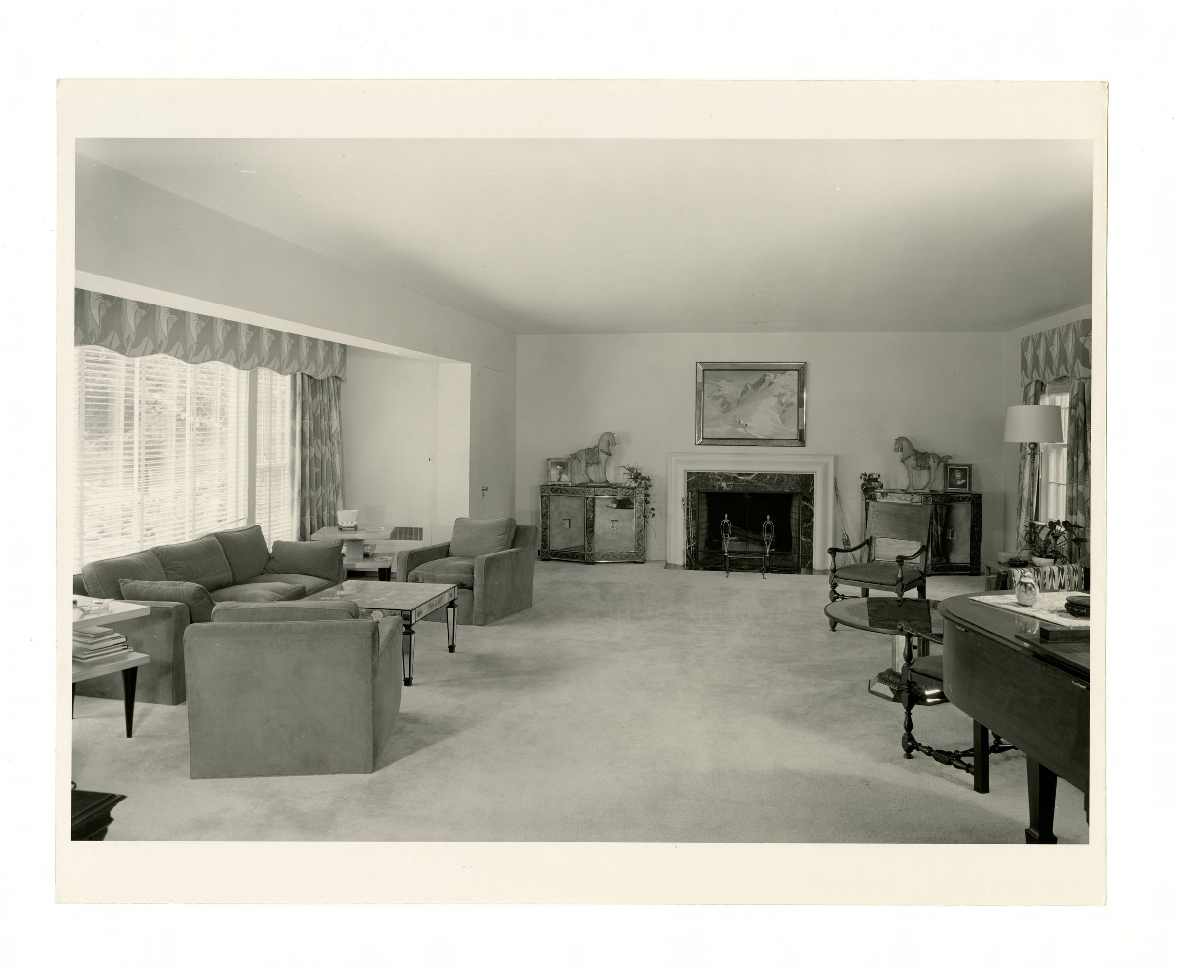 View of the living room showing chairs, a sofa, a fireplace, sculptures, and a grand piano.