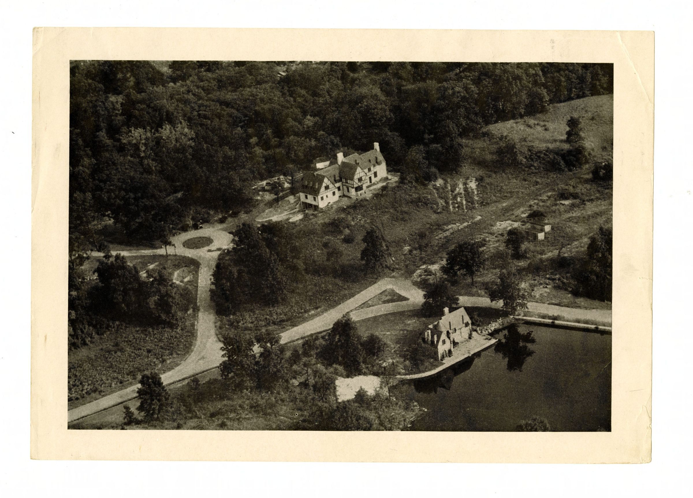Aerial view of the Ramanos estate showing the driveway, roads, the house, and part of the lake.Collection
