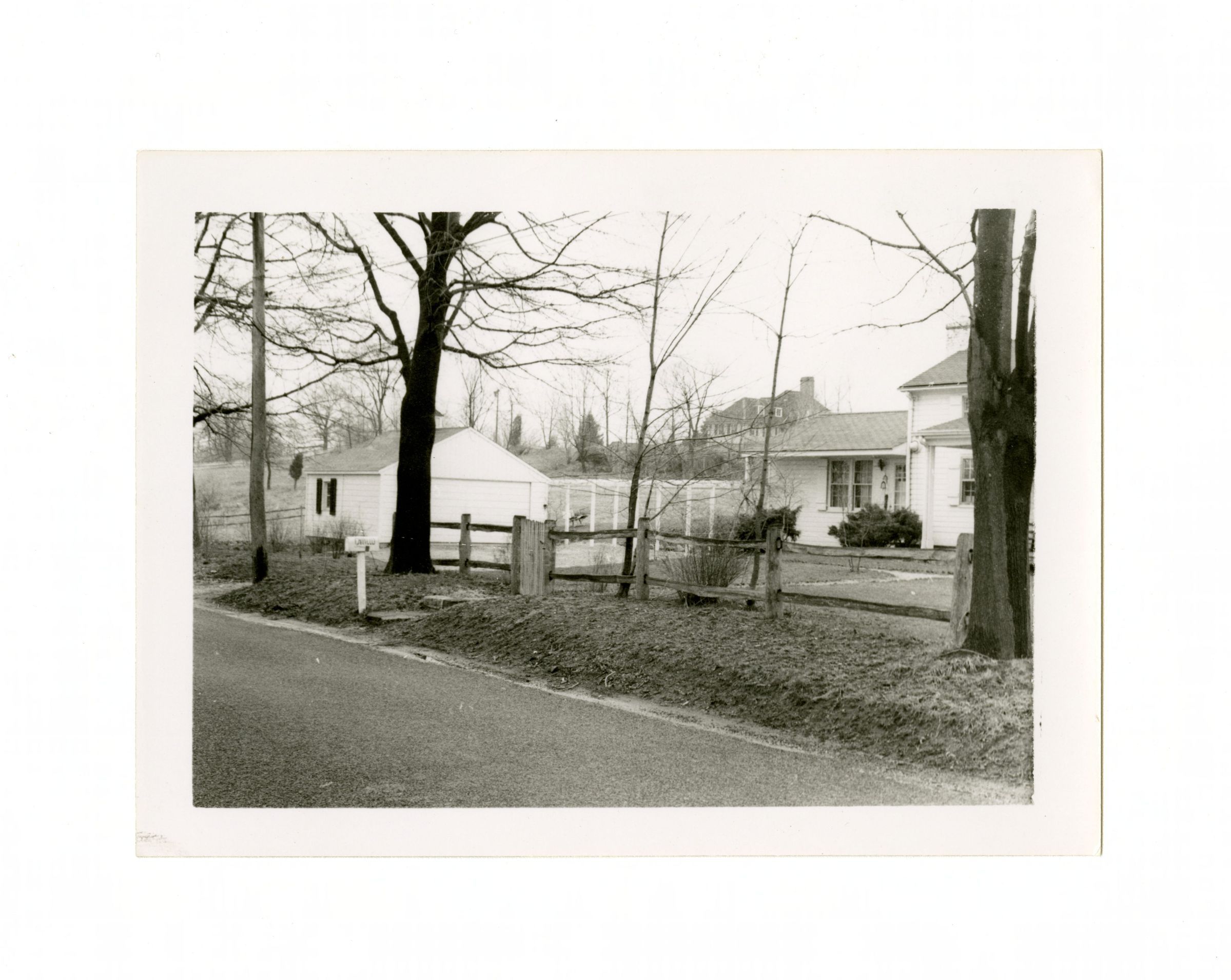 View of the house from the road showing the garage, fence, and mailbox.