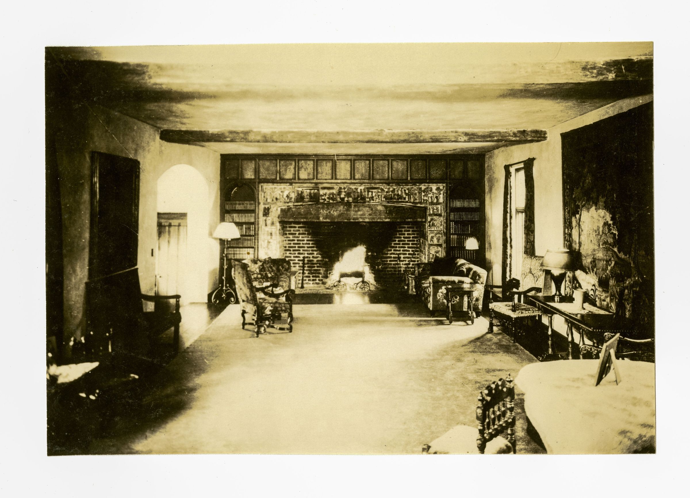 A view of the living room with beams on the ceiling and a copper-hooded, brick-lined fireplace.Collection