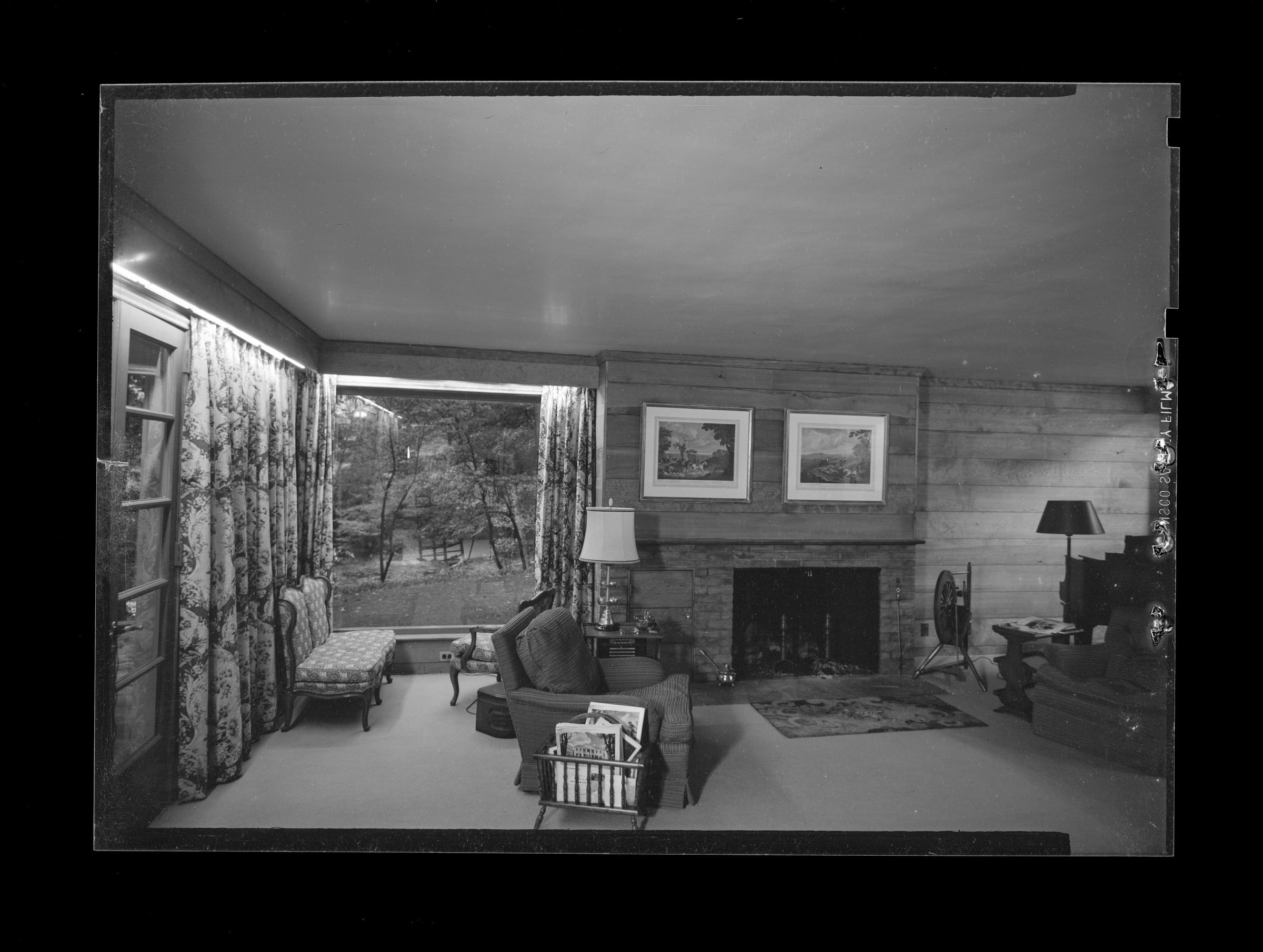 A wood-paneled room with a fireplace, a wall sized window is on the left of the image with trees and part of the lawn visible.Collection