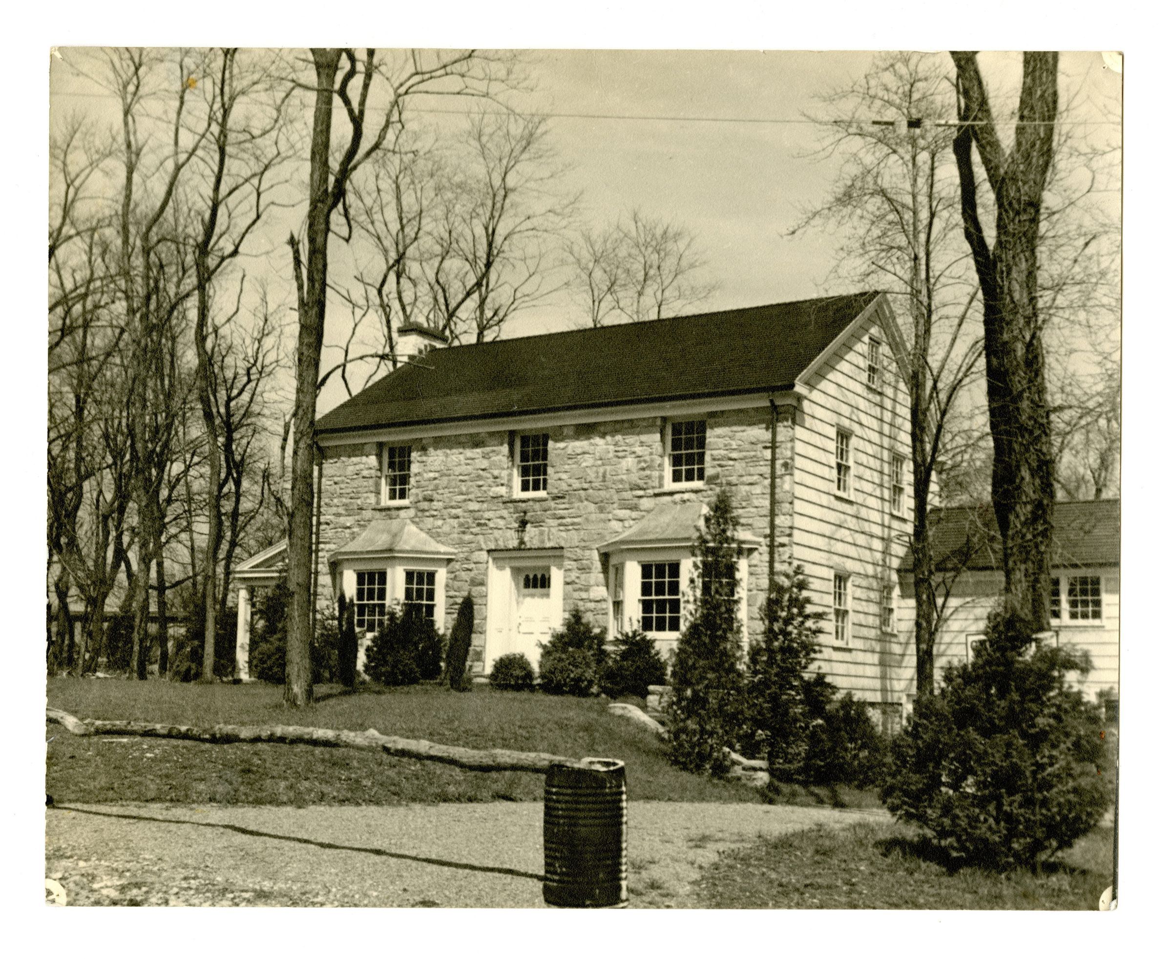 A stone fronted home with shingled sides and a view of the front lawn and driveway with a tree-branch barrier across it.Collection