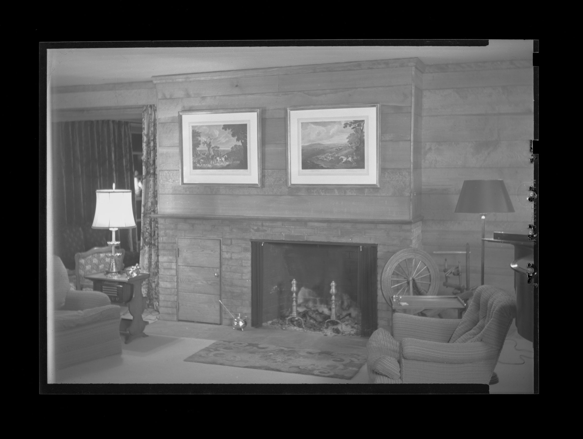 A wood-paneled room with a fireplace, armchairs on either side of the image and a spinning wheel on the right of the image.Collection