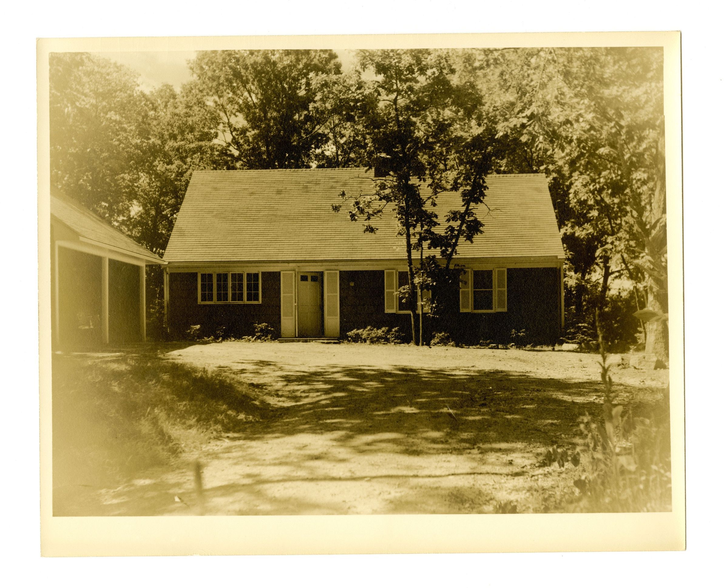 The front of the house with the front door ajar. The garage is on the left of the image.
