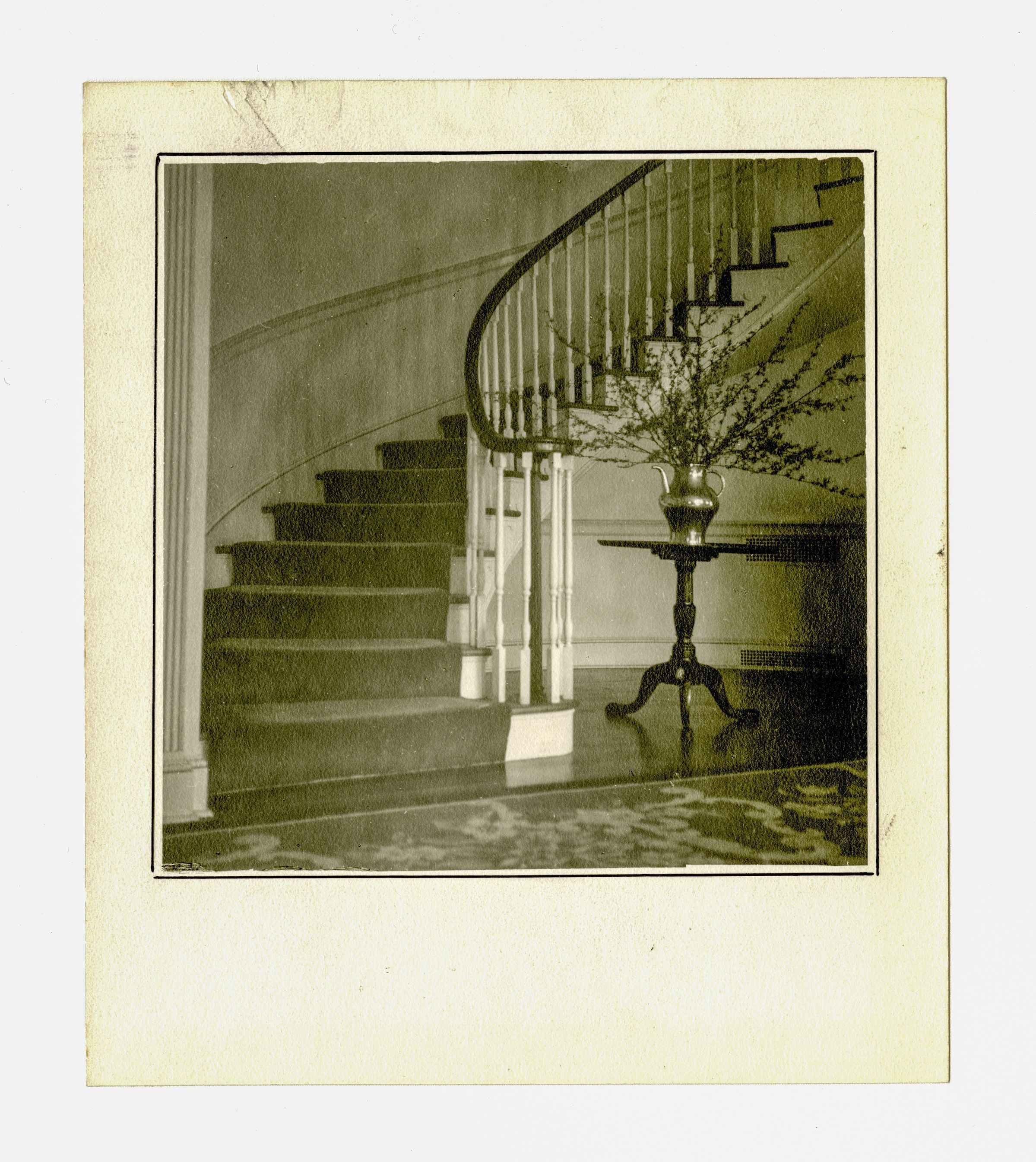 A curving, carpeted staircase with a flower arrangement sitting on a side table to the right of the stairs.Collection