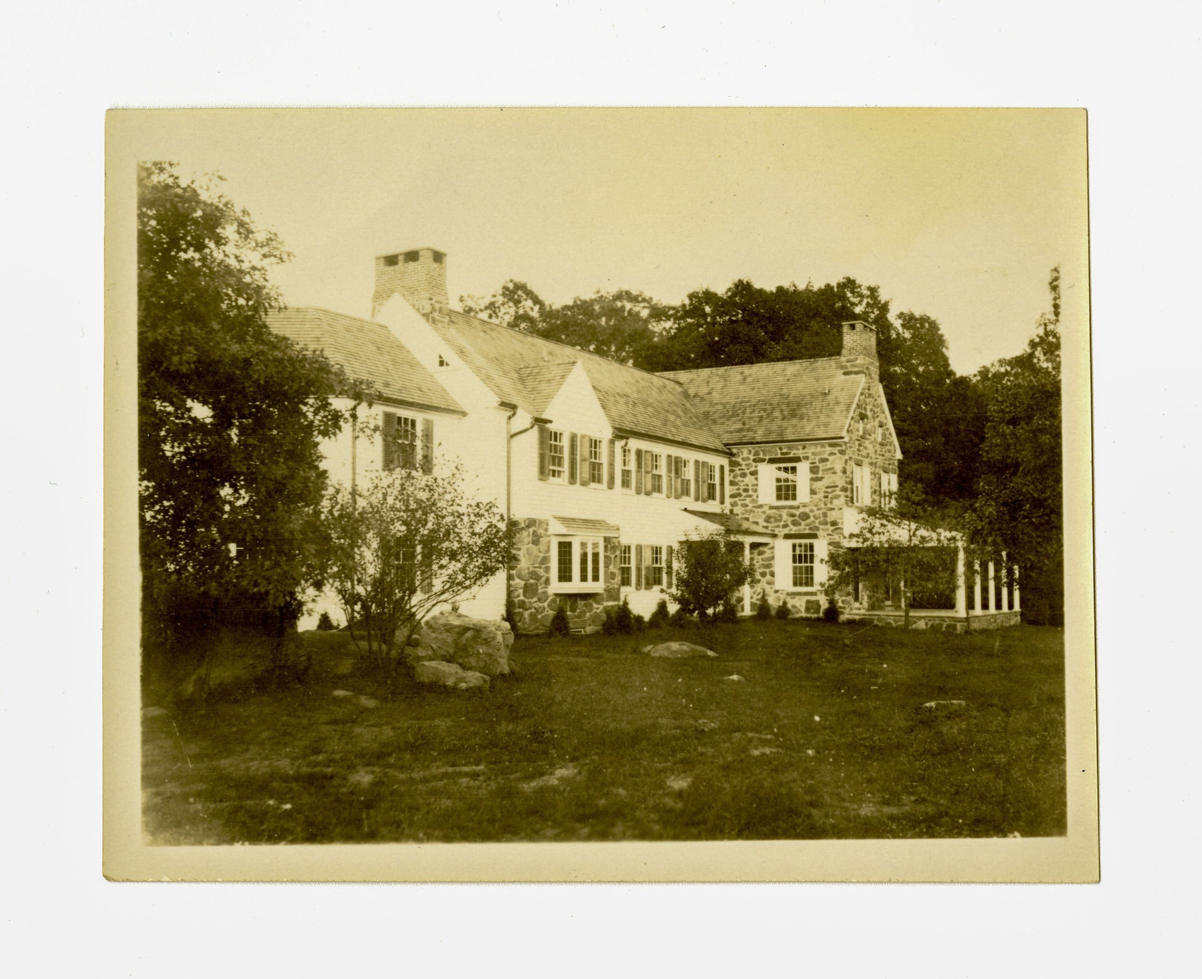 A stone and clapboard house with a covered outdoor area and part of the lawn.