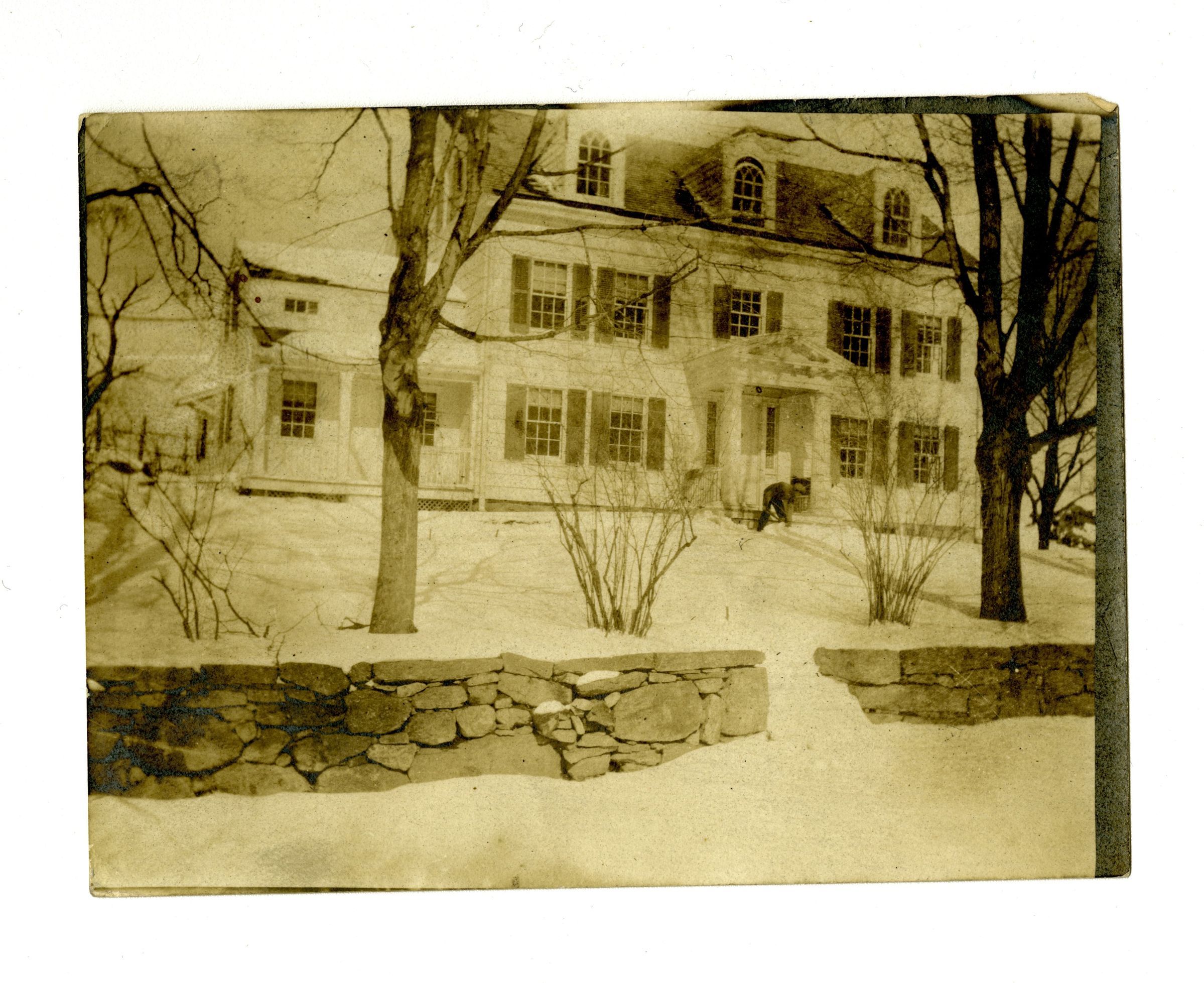 A three-story house in the snow; a person can be seen in front of the door potentially clearing the snow.Collection