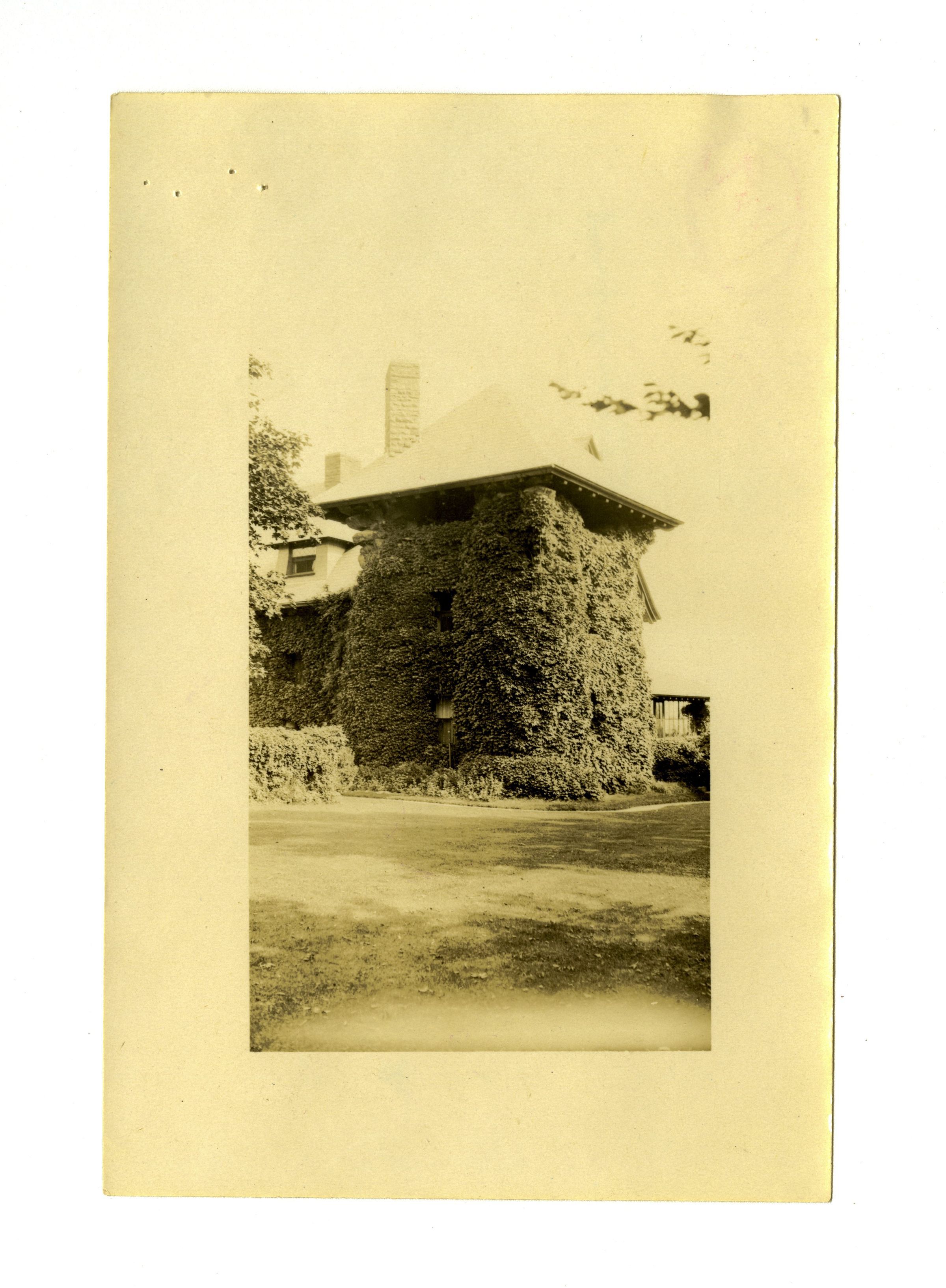 An ivy-covered tower-like structure with a large overhanging roof. Likely one of several outbuildings on the five-acre estate known as "The Boulders."Collection