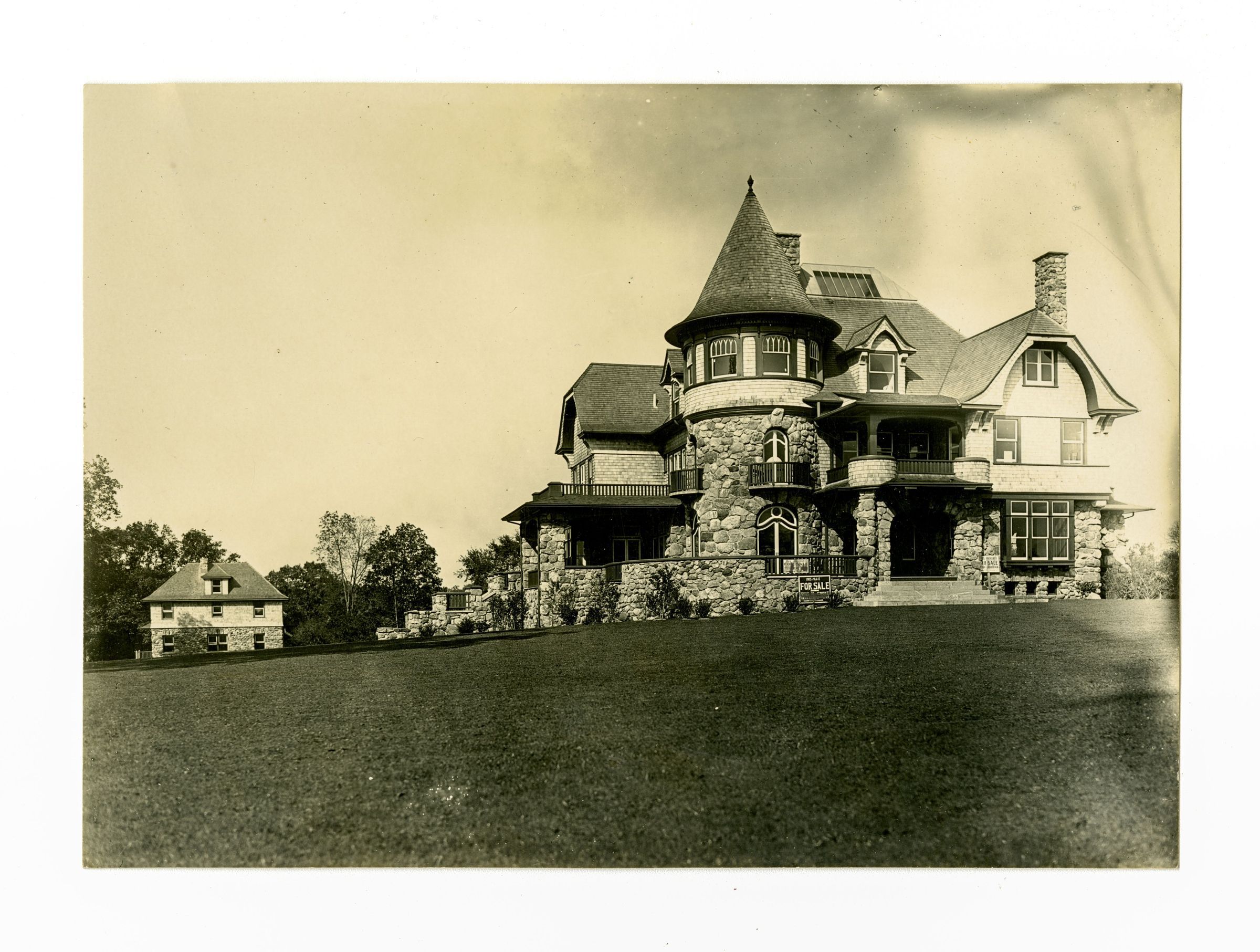 A large stone and shingle home with a round tower on the corner closest to the viewer.